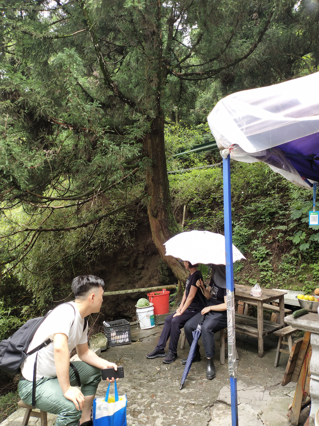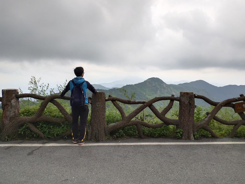 大概半个小时安全到达山脚,一下车,空气热腾腾的与山上的凉爽是两个世界,顿时觉得自己是仙人降落人间……。民宿的老板还没有把我们的行李带到山脚,因为又有客人进店住宿,所以需要等他下山。向山上望去,只有轻烟与白雾,山峰化在白云后。