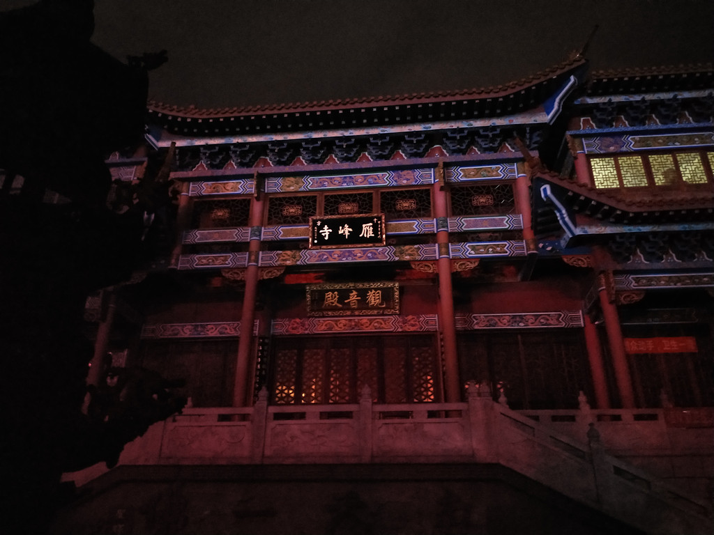 雁峰寺台阶前的浮雕精美,寺庙建筑整体高大,大门已经关了,阁楼房间的灯还亮着。