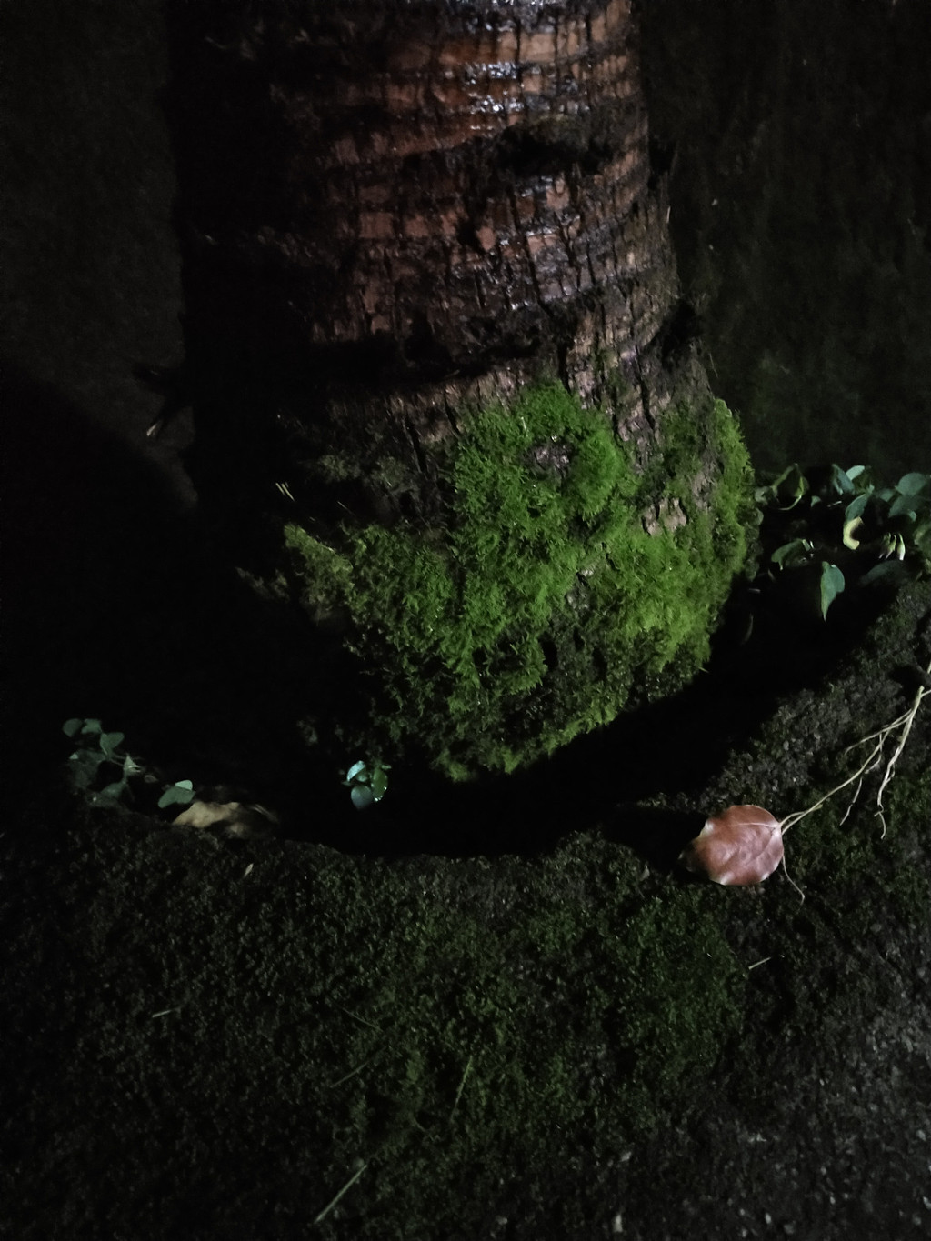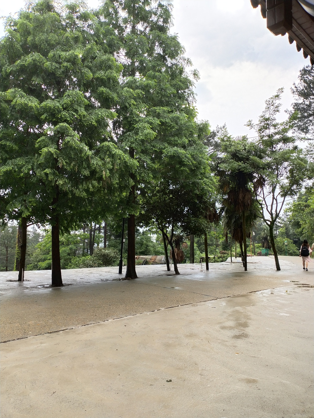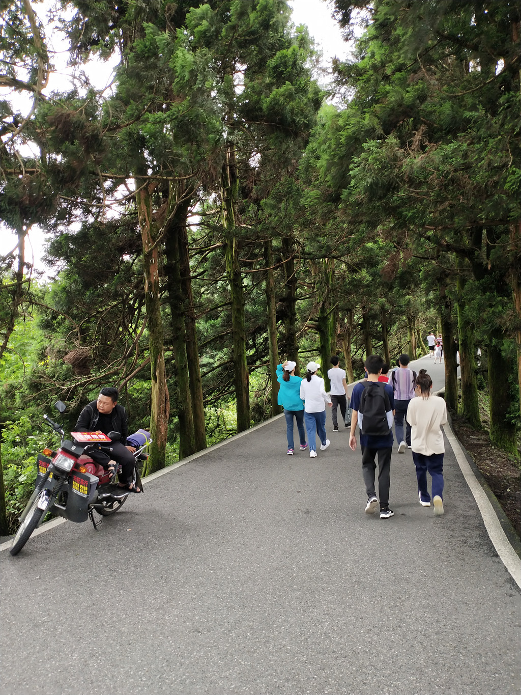 水泥路面湿漉漉的,大部分人坐小班车沿大路上山,也有人沿大路旁的小路上山,小路也是水泥路面,可以容许两个人并排走走,地面凿有小坑洞,可以防滑,虽然潮湿,但是不影响走路。林区树木高大,有的林区下的杂草不多,厚厚的树叶遮盖地面,土壤肥力佳,大多数地方有灌木或藤状植物,来到了植物的欢乐世界,处处都见到它们的身影,叶子绿油油,随风摇摆,尽显生机。
