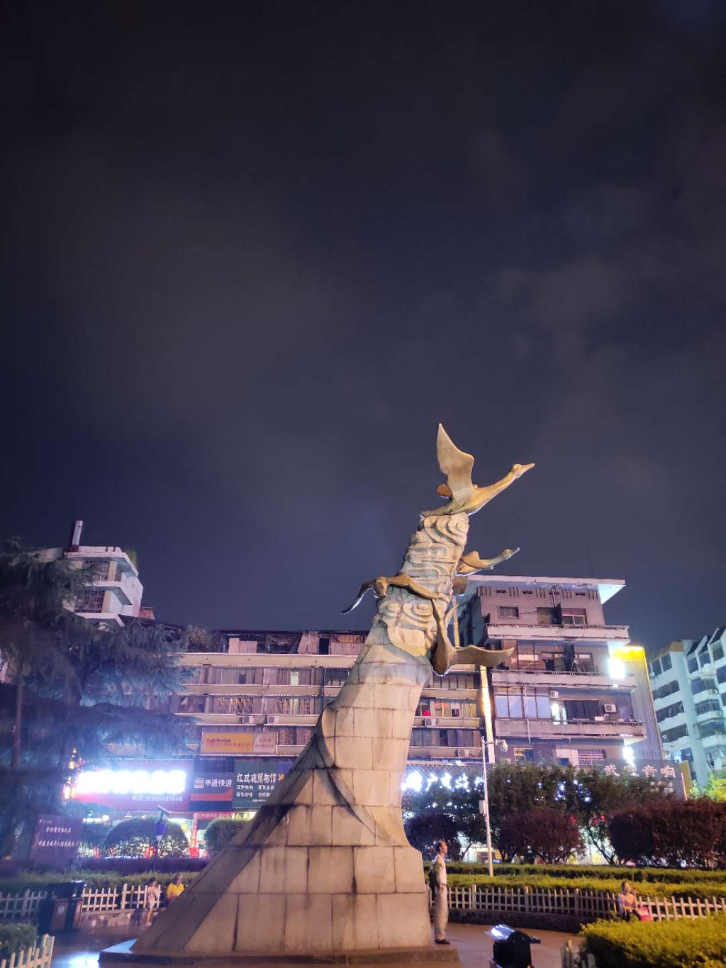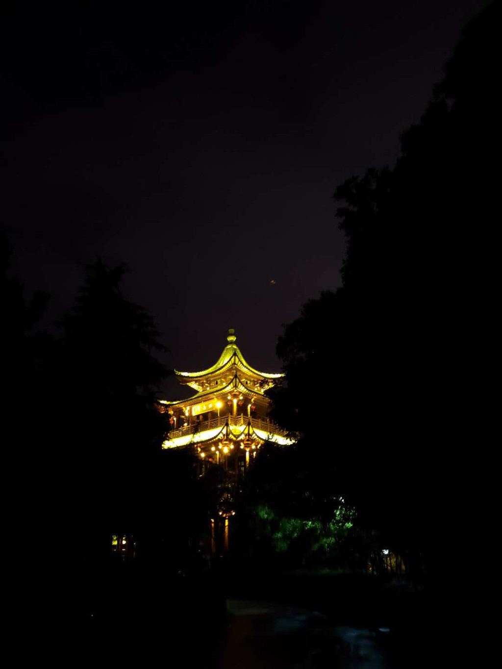 寺里有观音殿和寿佛殿,平时的香客应该是络绎不绝。到山脚时忽然看见明清之际杰出的思想家、哲学家王船山的大理石雕像,站在雕像旁边与思想家来了一张合影。山脚下的公园寺庙建筑非常多,有来雁塔、雁峰寺、回雁阁、王船山纪念馆,汇集了“大雁文化、宗教文化、王船山(王夫之)文化”。回望山峰,灯塔都亮起了金色的光,夜空分外宁静。一些游人好像也是远行客,尽管地面湿漉漉,灯光昏黄看不清寺庙的结构,但是也在调整角度,抓紧时间拍照。20分钟游览完成,回望高塔金色光芒,却被他们的思想光芒所感染。