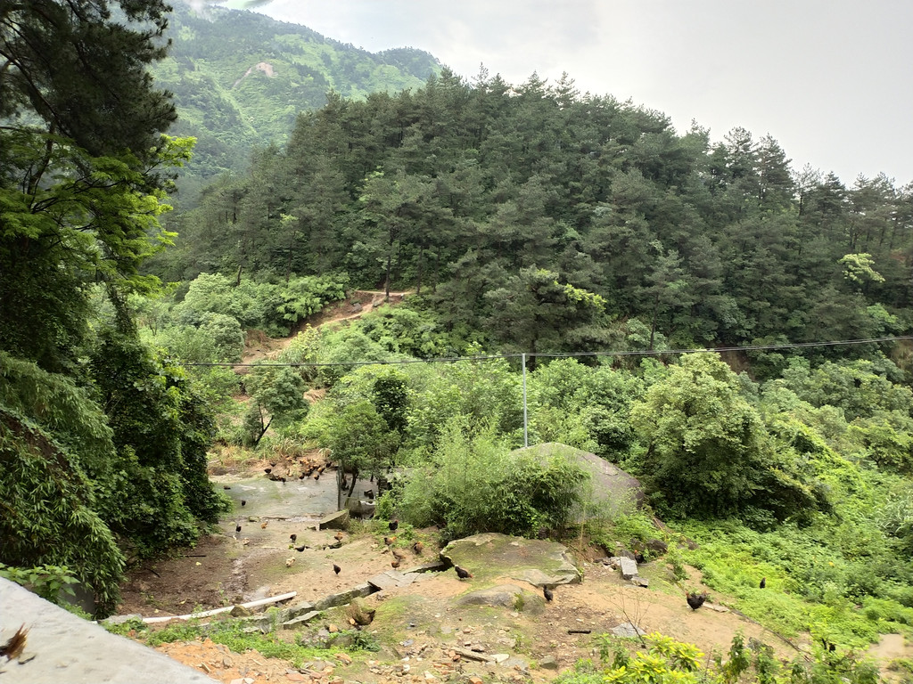 民宿周边树林高大茂盛,松树、银杏、杉树等等,山坡下是养鸡场,鸡场杂草丛生,养了很多的黑毛鸡。