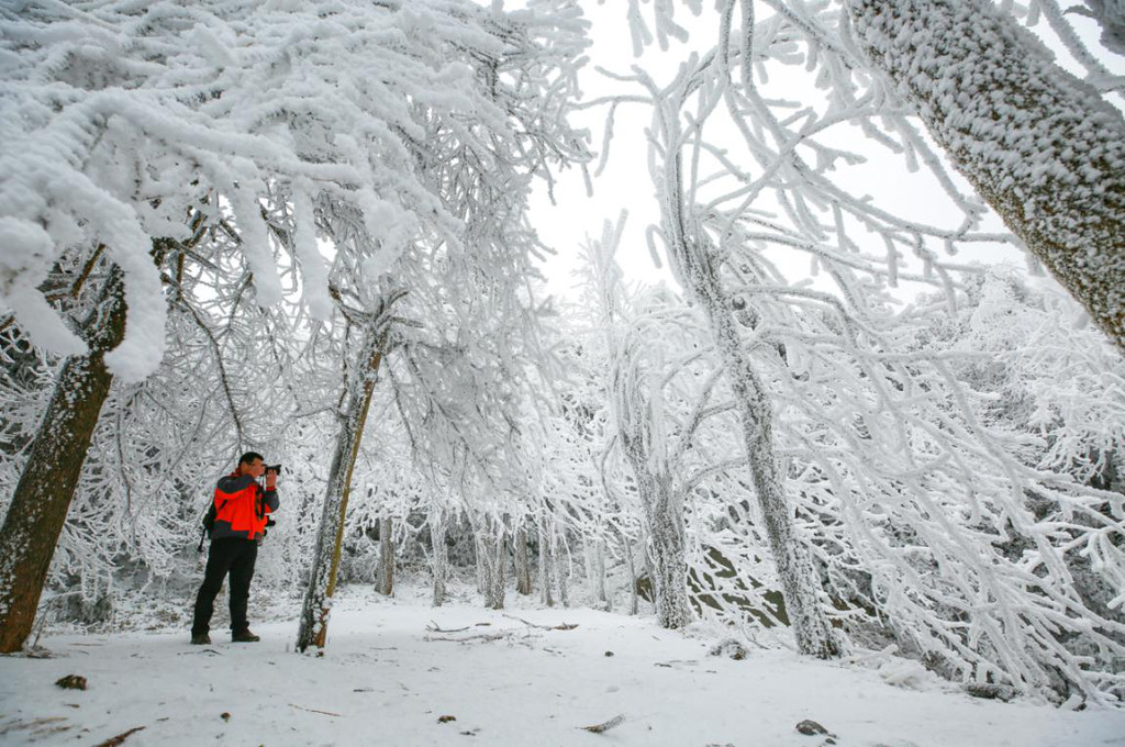 随着近日南岳气温骤降,大自然的鬼斧神工一改南岳衡山往日青葱,衡山群峰披银戴玉,皑皑白雪铺满大地,垂柳苍松凝霜挂雪,游客漫步其中,如置身于冰封仙境。“我特意坐高铁过来看雾凇,虽然天冷但很值得。”一名女性游客称赞道。
