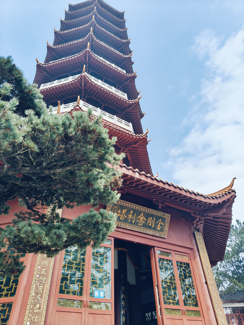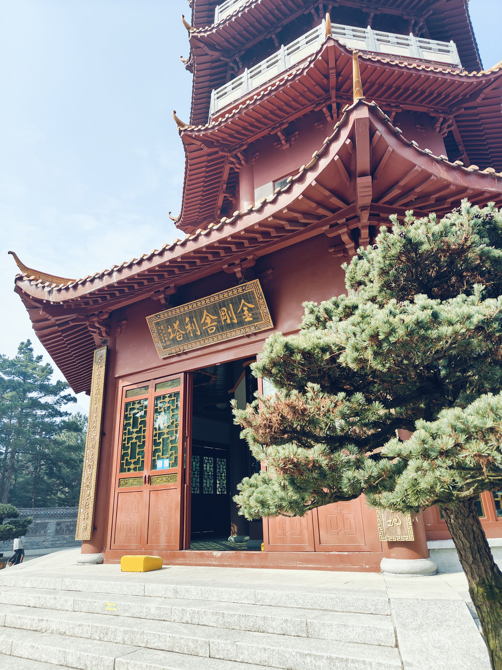 南台寺旁上行不远即是是金刚舍利塔,入塔,入门即见高耸净白佛祖立像庄严慈穆,合十三拜后,看右侧上塔楼梯标示請脫鞋上,正準備脫鞋時,一旁守塔僧侶友善的拿了鞋套表示也可穿鞋套上,僧侶協助下放下背包穿上鞋套,拾級而上。塔內清幽,每層各有不同佛像,一一合掌禮拜,正好一組人下來,兴奋对我说道,可惜你来晚了,差一点就能看到舍利子,微笑回应道一切随缘。出舍利塔,顺时针转塔一圈续前行。