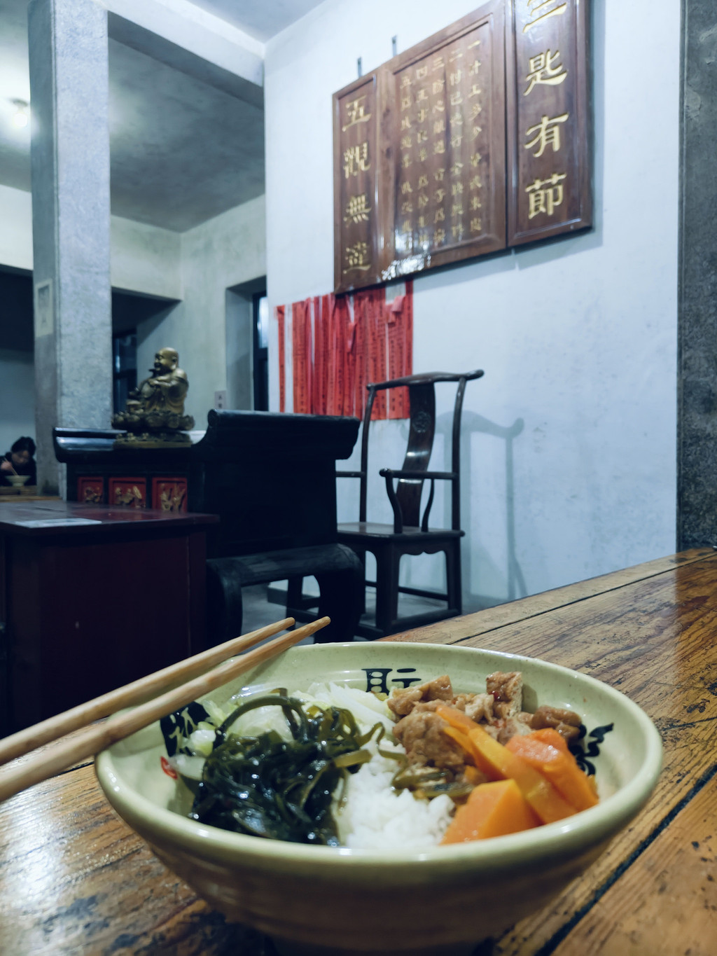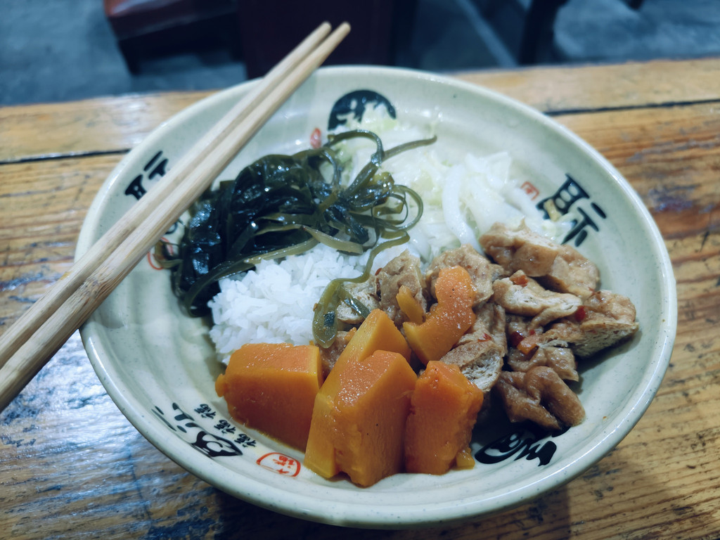 简单放了行李出来先吃斋饭,应是过了饭点,斋堂只有两三人在静静地吃,自己拿个大铁碗,到后侧自取,四道斋菜,有海带,豆干,南瓜,青菜,饿了一天,吃了两大碗暖香暖香的。