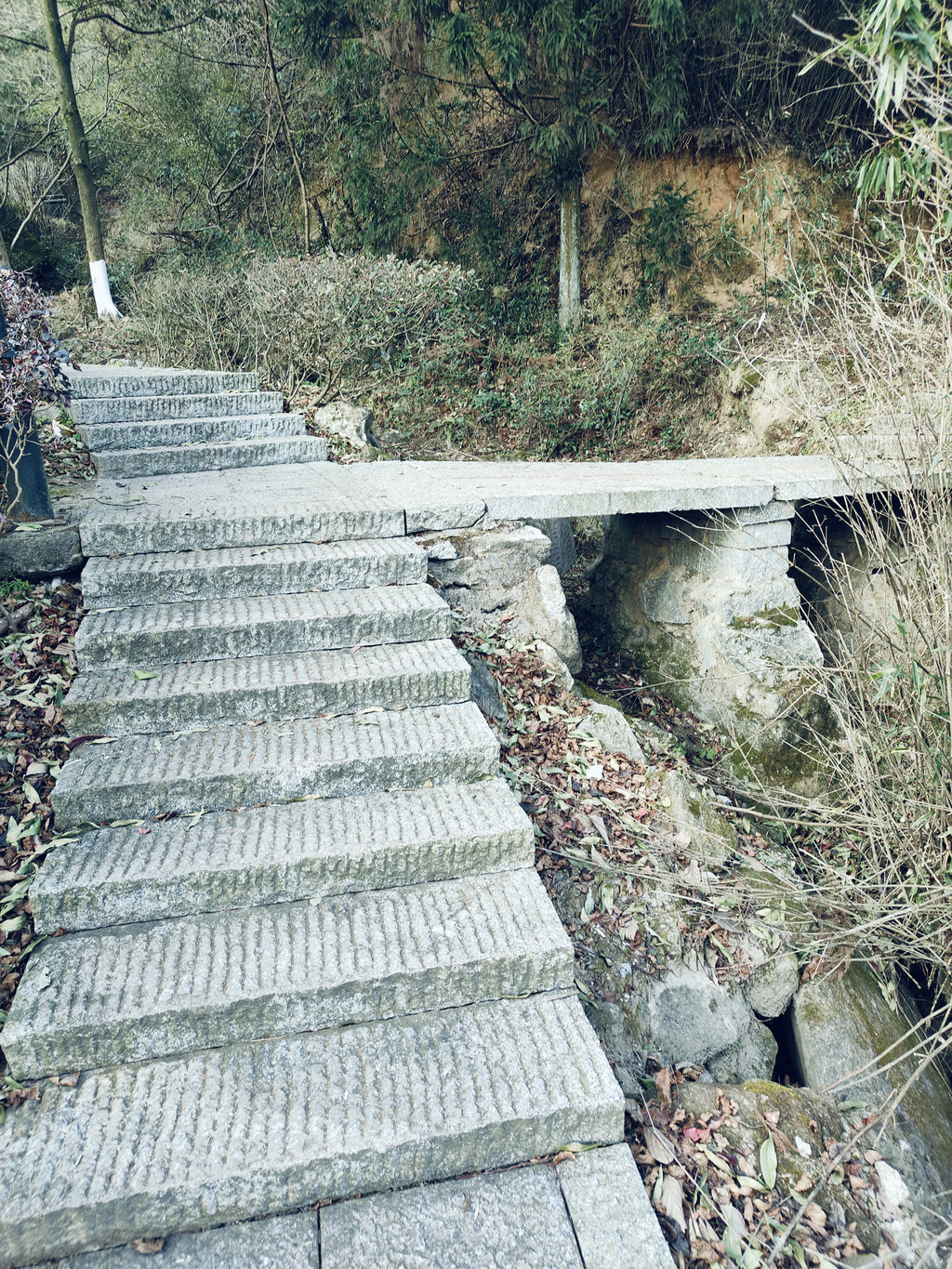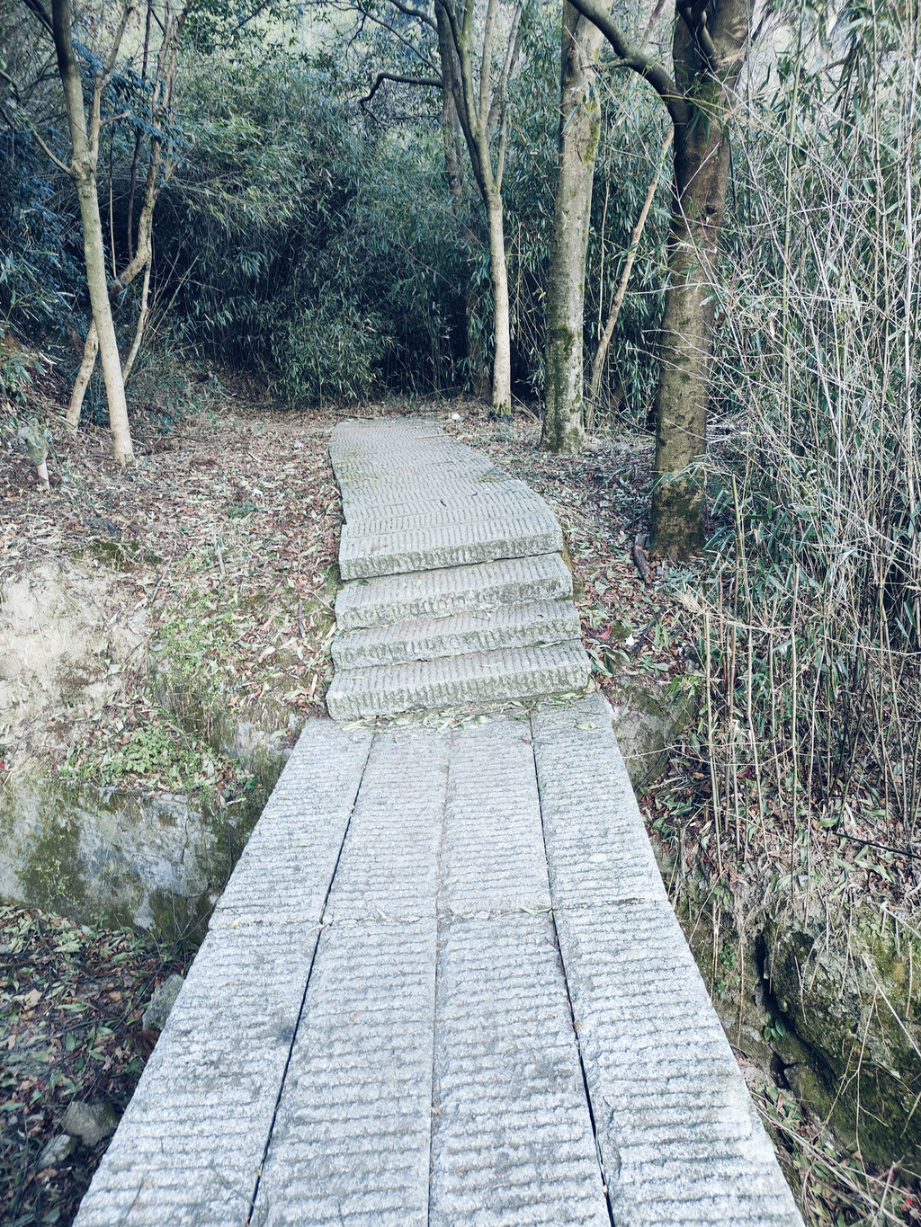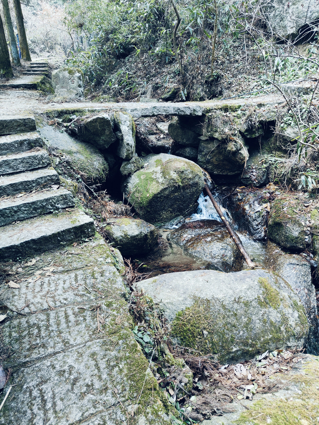 见梵音古道标示转入木栈道,过磨镜台后,再度踏上石阶 林道 ,这段还算缓步上升,过了麻姑仙境后再度开始陡上坡,岔路多一路标示不是很明显,时时检查地图,特别是在绕经烟霞仙境时,一度找不到上行的路但却听到人声,找十来分钟才在一左沿过石桥后的左侧找到不明显小路。