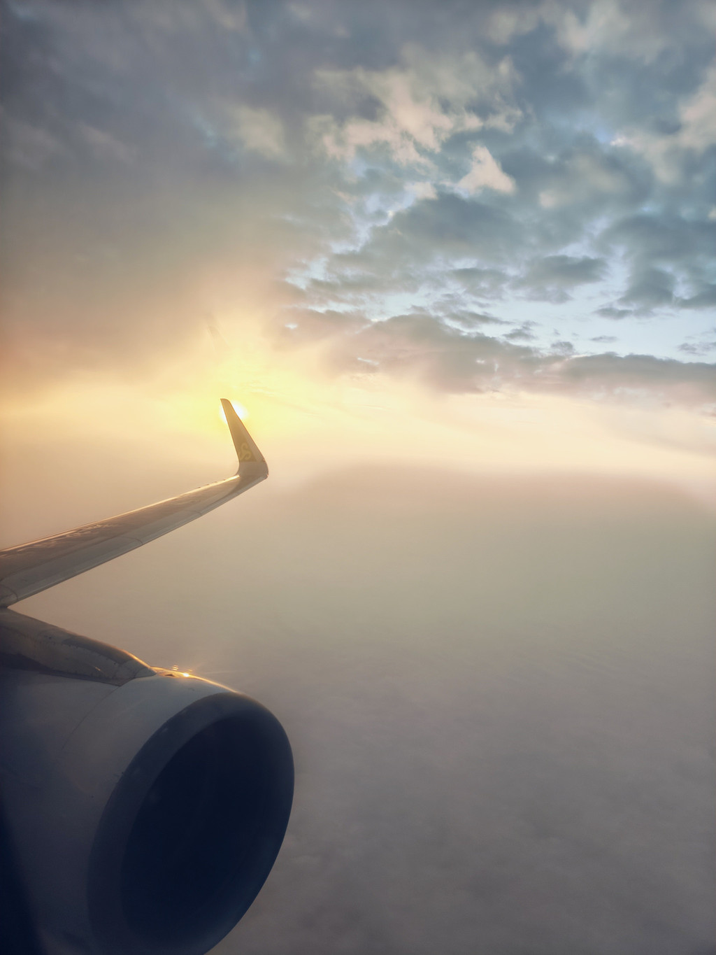 飞机穿过云层,日出阳光洒白云上一片金黄…