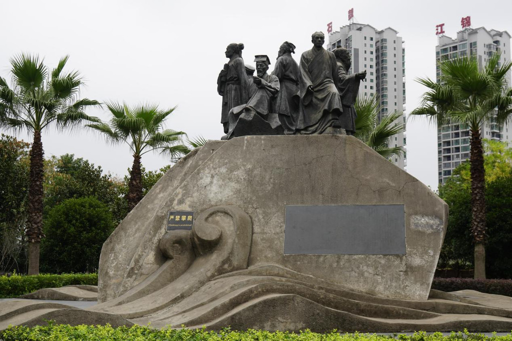 走进公园首先看到的是七贤群雕。他们是李宽、李士真、韩愈(作《合江亭》)、周敦颐(湖南省道县人,外祖为衡阳大户)、朱熹(石鼓书院讲学,著《石鼓书院记》)、张栻(石鼓书院讲学,集“湖湘学派”之大成,东南三贤)、黄斡(宋理学大师,石鼓书院讲学,东南三贤)。