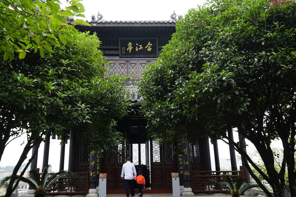 唐贞元3年(787)齐映任衡州刺史,在石鼓山东面建一凉亭,取名“合江亭”。805年韩愈赴任途中路过衡阳,赋诗一首“红亭枕湘江,蒸水会其左。瞰临眇空阔,绿净不可唾”,争相传诵,打动了后来人。