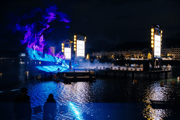 湖面灯光秀:金月湖上,水上舞台立于湖中心,绚丽的灯光秀映射出南岳里的全貌,光彩夺目。