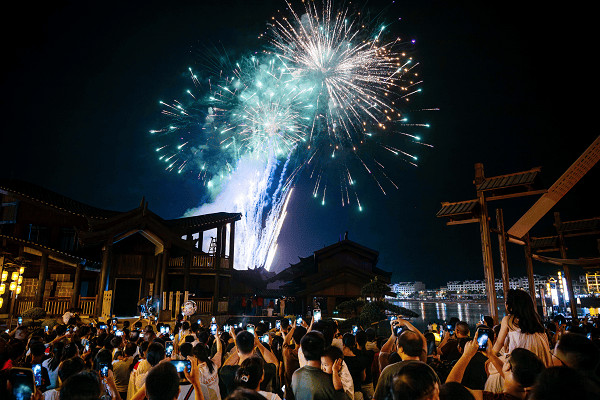 烟花秀:天为幕,金月湖为景,南岳里为舞台,在湖中心灯光秀的映射下,大型烟火秀从湖上喷薄而出,聚拢是烟火,摊开是人间,每一束焰火里都守着一份幸福安康。