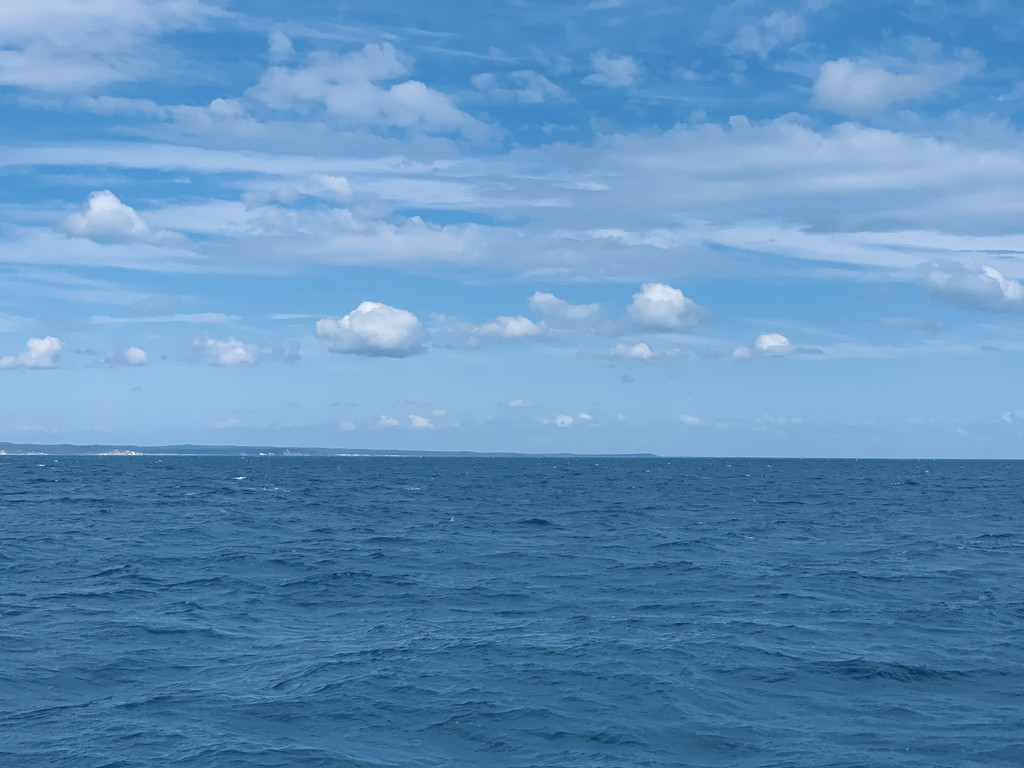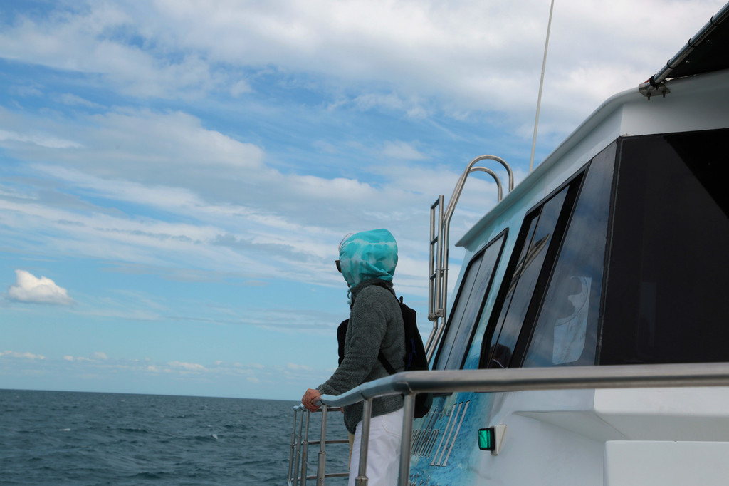 多云的天气,船有些颠簸,偶尔还下雨,风浪和雨水啪啪打脸上,有穿得少的人冻得发抖。