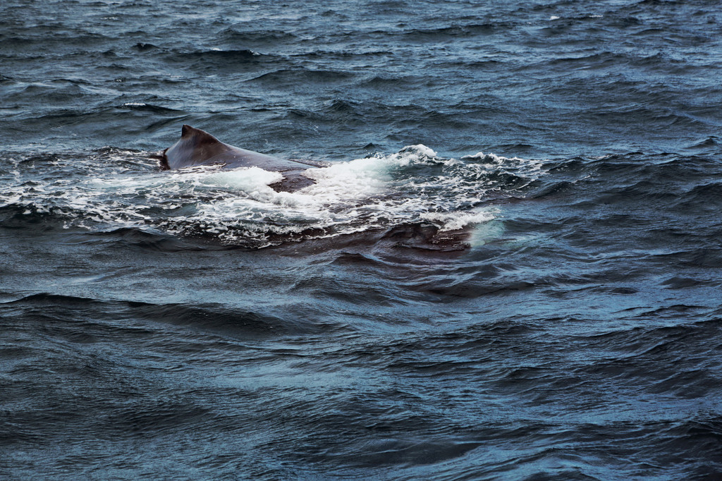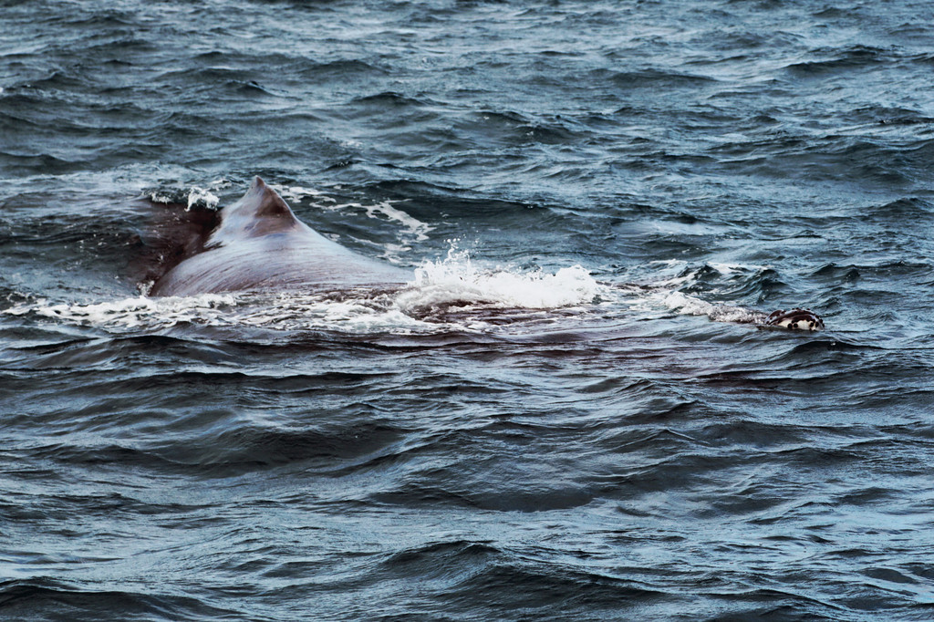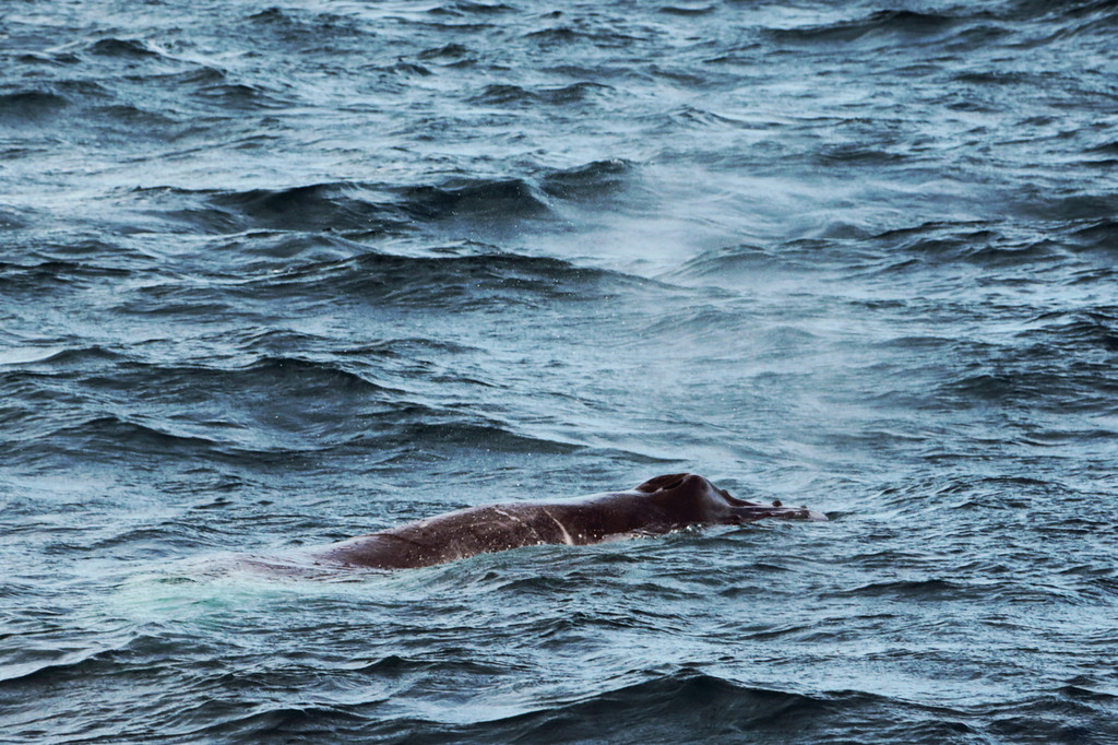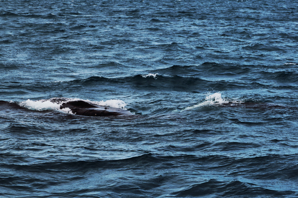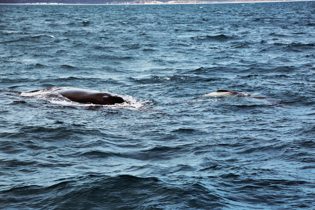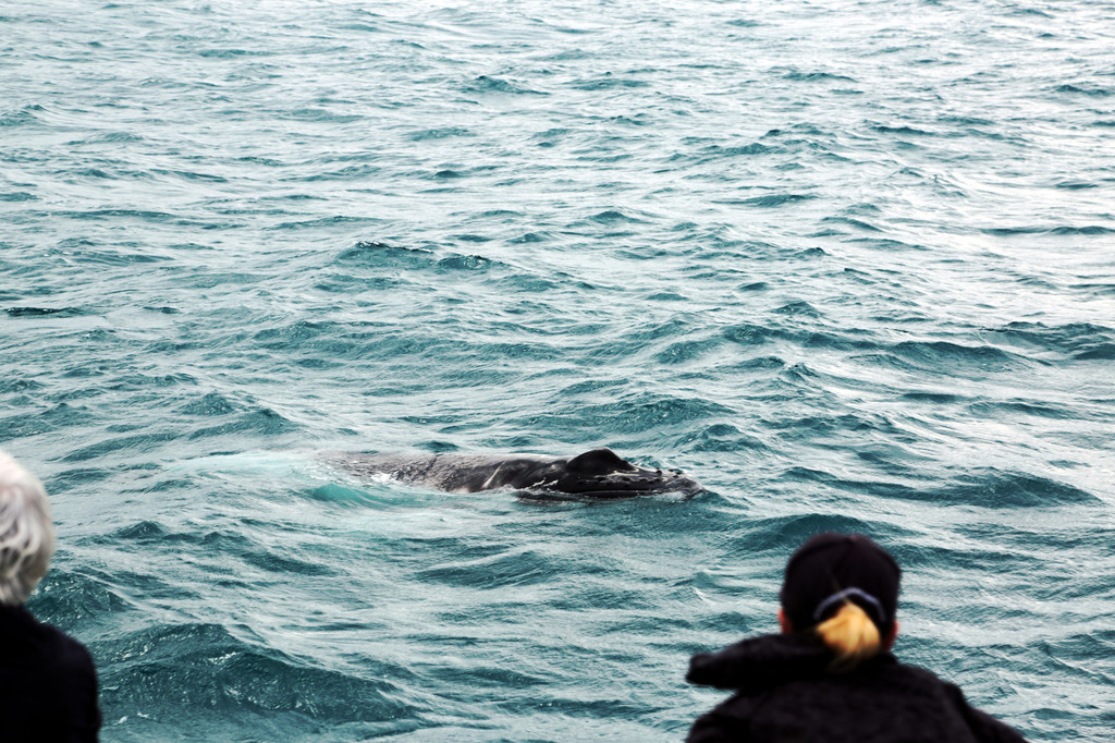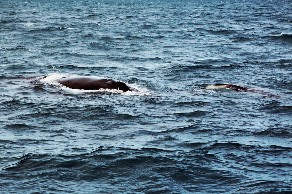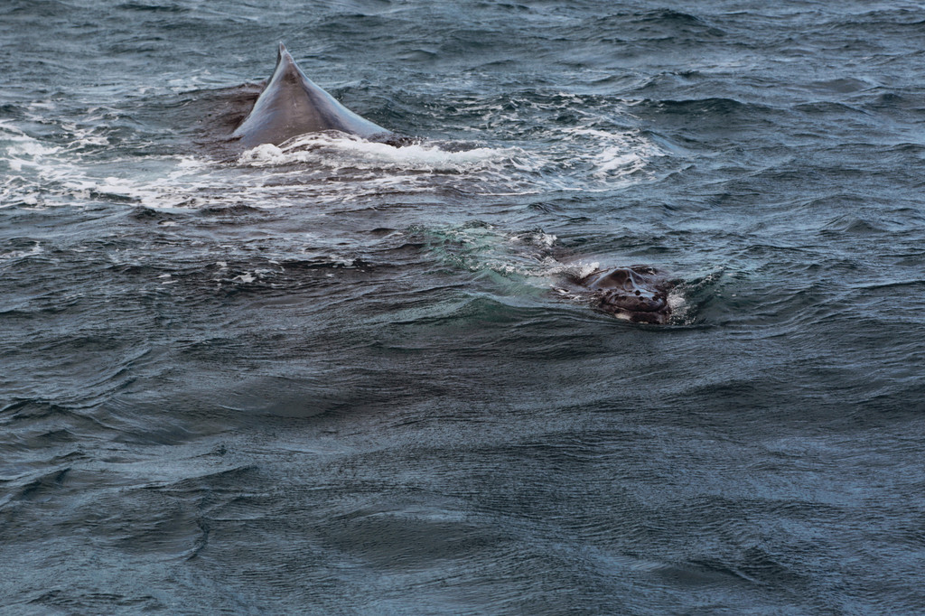 以为会与鲸鱼无缘,结果,见着了一对又一对鲸鱼母子,也有单只没带孩子的,最幸运的,是有一对鲸鱼母子围着船转了一圈半,船上的人越是对它们欢呼挥手,它们越是来劲,在船边转得越欢。终于知道为什么人们又称其为“海中人来疯”了。