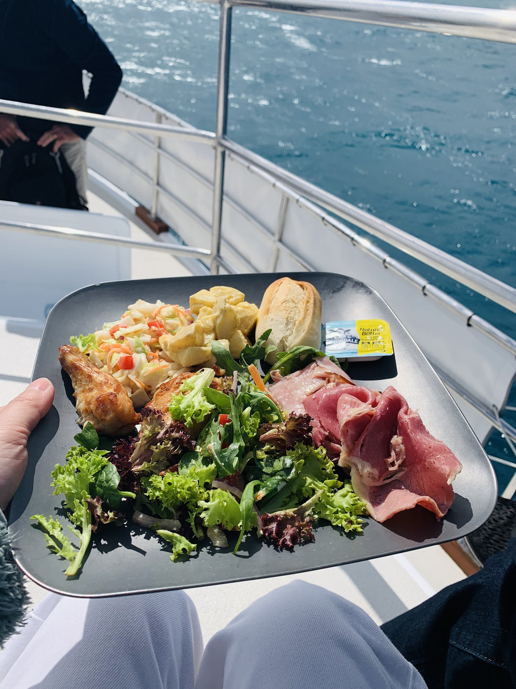 船订的全天的,在船上六个小时,早9点车接至码头上船,9点30开船,到下午4点过返航到岸,船上提供了早茶、下午茶和午餐。