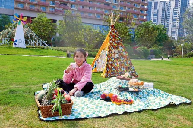 特殊时期,还是进行户外活动好。嫲嫲干脆带着两娃,在草坪上来一场家庭野餐。春光明媚,绿荫环绕,让人心情大好。