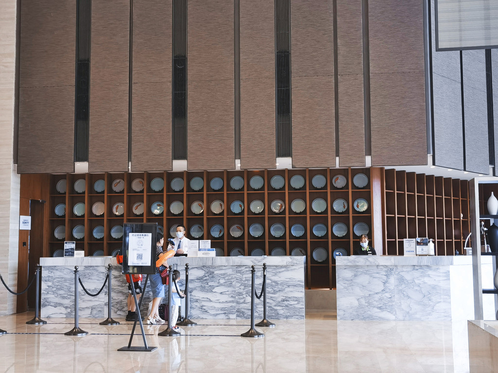 酒店前台的圆瓷盘装饰墙,体现着鹤山鱼米之乡的特色。