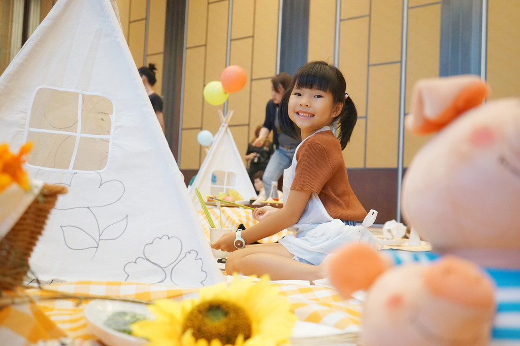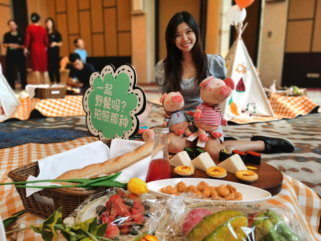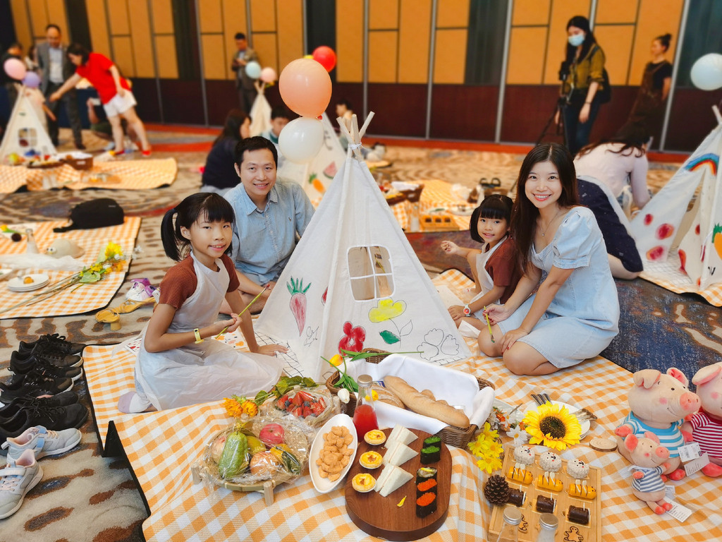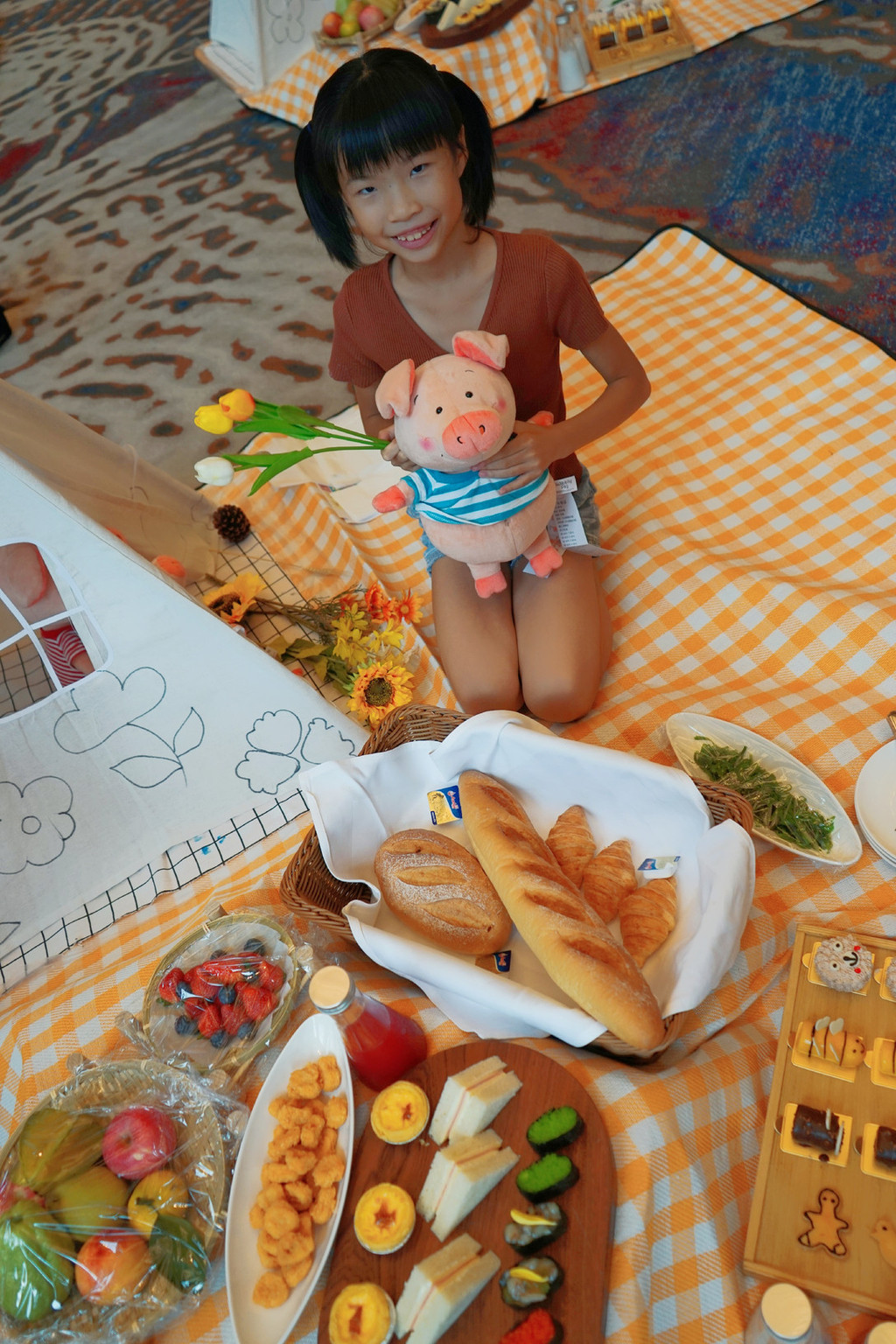 酒店还特别用心地为每个家庭布置了各具特色的道具小精品,也准备了丰盛的下午茶餐点,来,我们和小猪佩奇一起野餐吧!