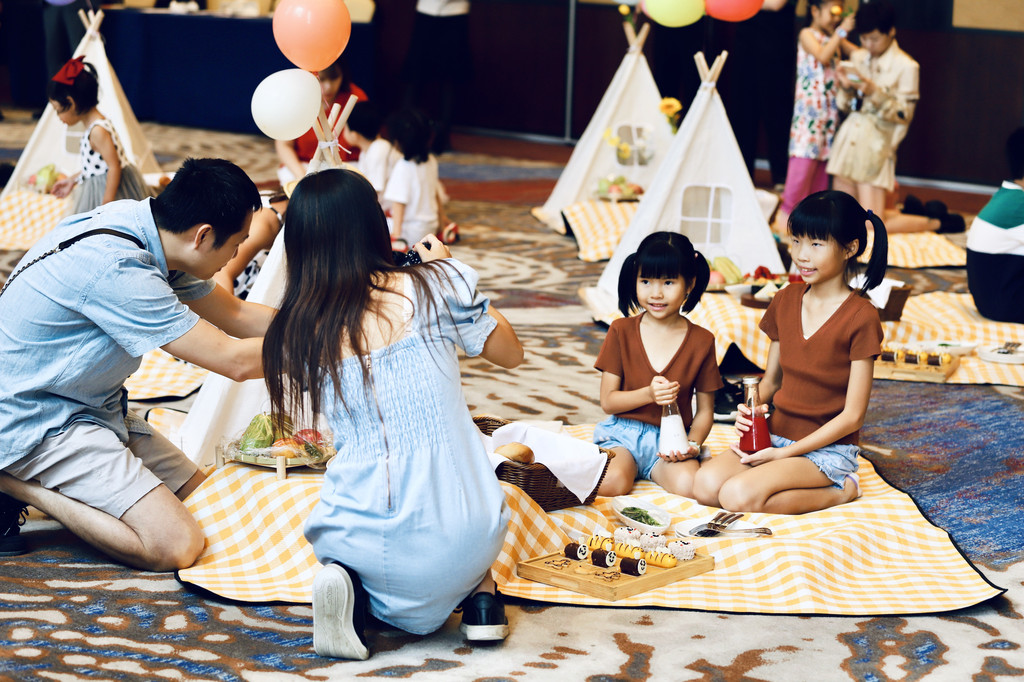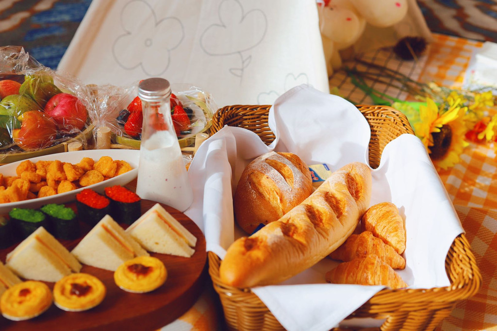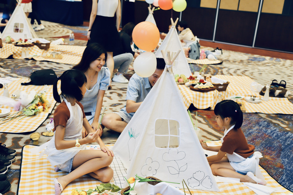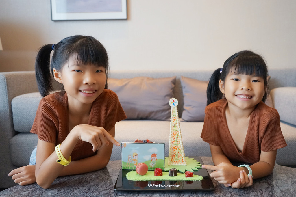 酒店还特别用心地为每个家庭布置了各具特色的道具小精品,也准备了丰盛的下午茶餐点,来,我们和小猪佩奇一起野餐吧!