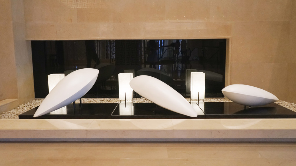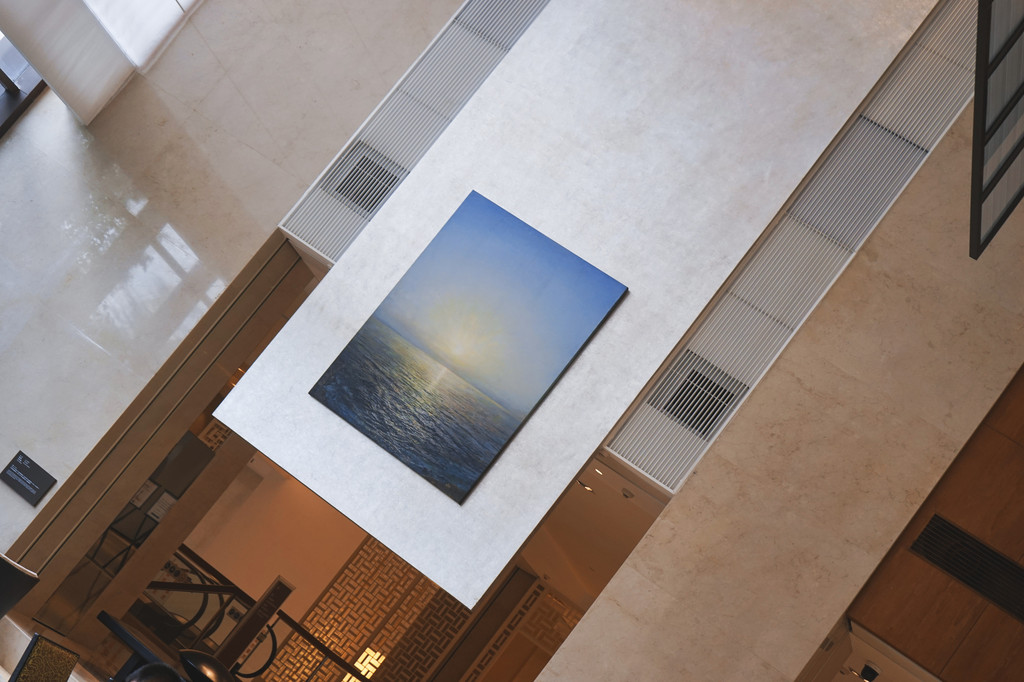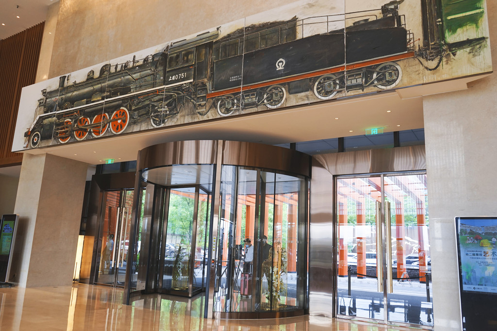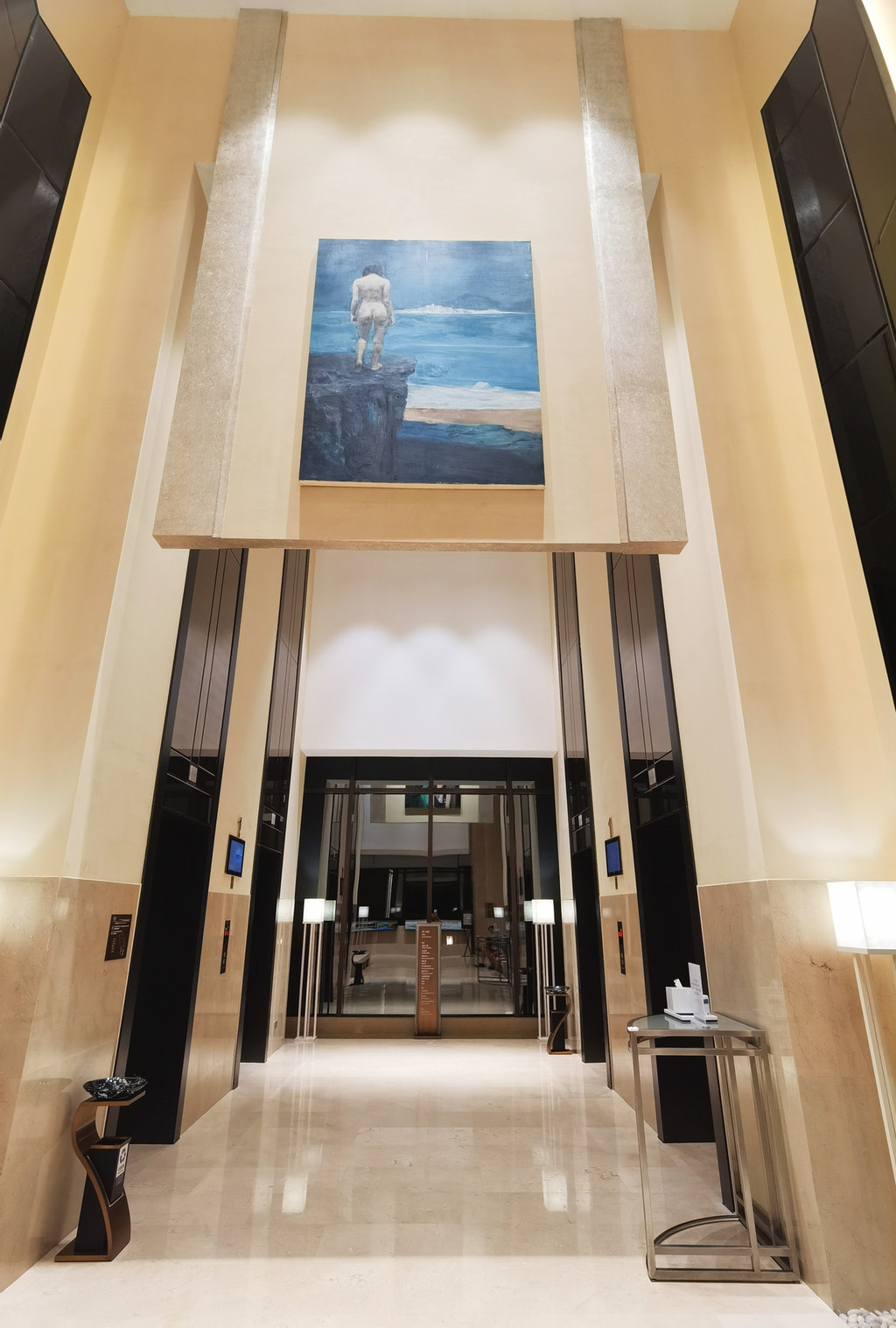 酒店内佳画藏品超过 20 幅,包括大堂大门上挂着的叶子伦的佳作《798 大火车》、大堂吧内的陆亮的作品《观沧海》,以及电梯间的李陈辰的作品《彼岸·冷城》和《微光·迷夜》,还有不经意间遇见的艺术摆品,岭南画派和新锐艺术家力作,静默无语但震撼人心。