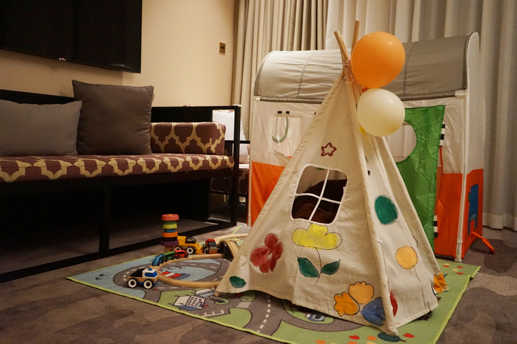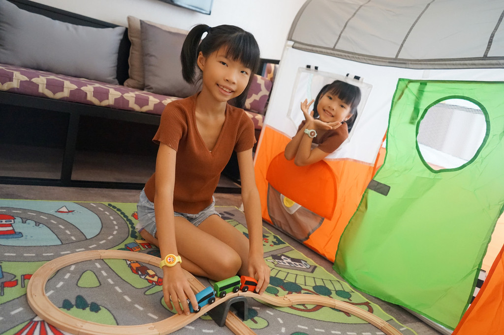 亲子房中的大熊公仔、帐篷、小火车套装、手工玩具,让宝贝们玩得停不下来~