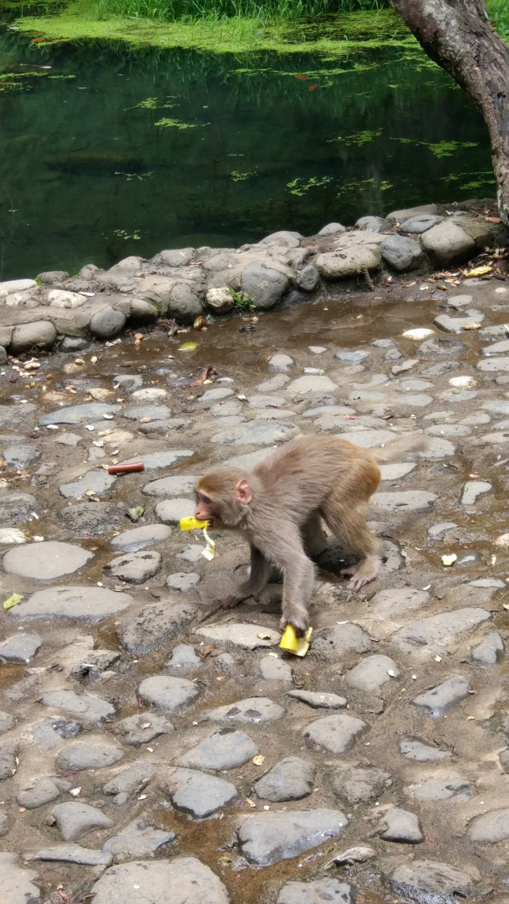 黑鱼河也是腾冲的一个景点,从停车场往山下走不远,就看到一个清澈的绿色小河,河岸上机灵的猴子在树上穿梭,看到游客手中有香蕉,急速的东张西望,判断没有危险迅速夺走,急转身头也不回的跑走,找一个安静的地方,剥开皮三口两口吞下肚。河里的黑鱼3寸来长,不怕人,摊主的烤鱼生意非常好,几分钟烤熟,抹些酱料,夹在饼里就是一顿美味是午餐。