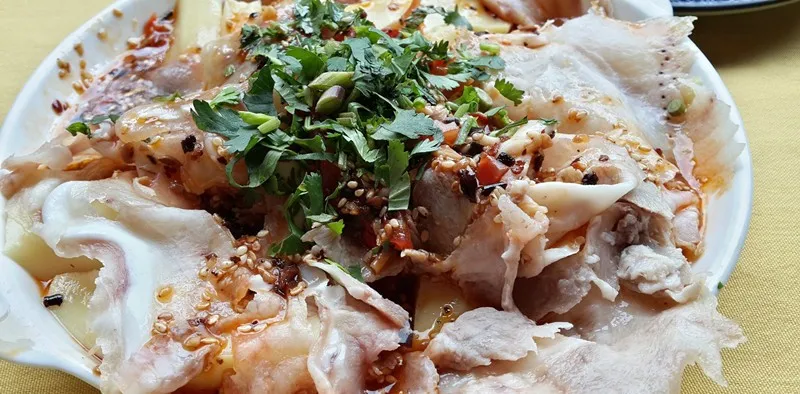 以猪头肉为食材,将其切成薄如蝉翼的大片,配以酸辣调料,具有咸、酸、麻、辣、香等多种滋味。大薄片的制作工于火候,长于刀法,片薄透明,与川菜中的灯影牛肉异曲同工。口感脆嫩,有嚼劲,清凉爽脆,肥而不腻。