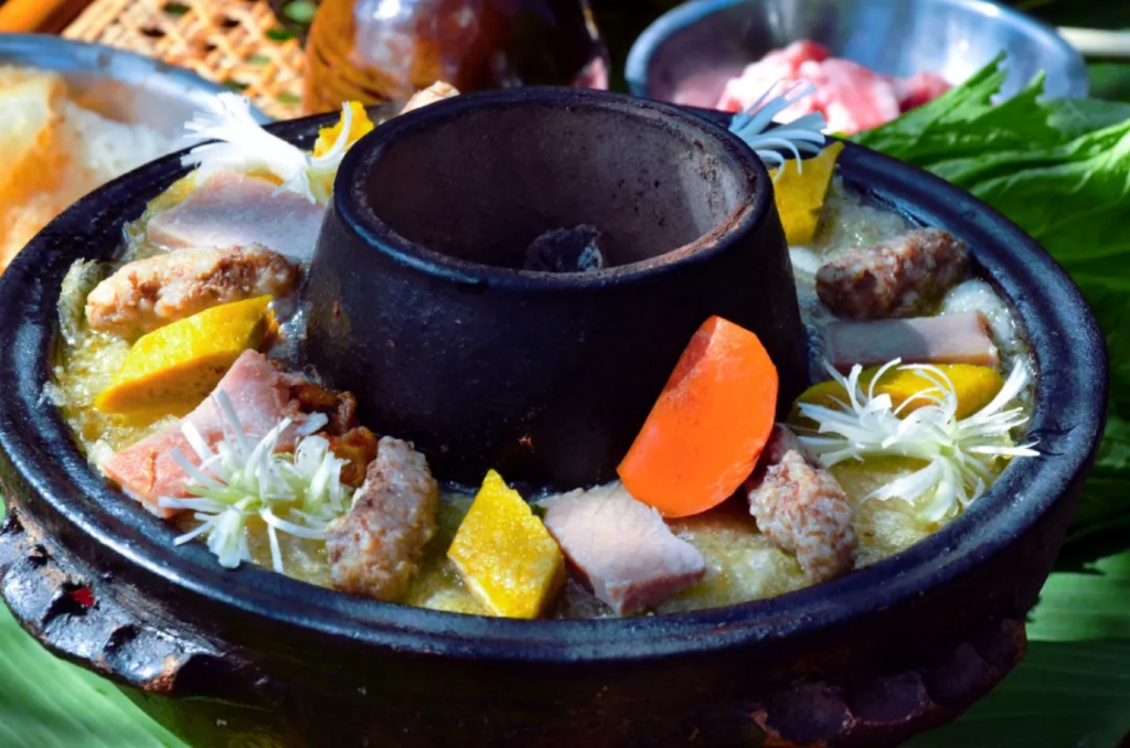 土锅子讲究微火慢煮,味道醇正鲜美,以鲜肉骨头汤为底料,加上青菜、芋头、黄笋等,上铺一层用油炸、以冷水浸泡、切成薄片的猪皮,点缀一圈蛋卷,即成一色香味俱佳的土火锅;后起名“火山热海”。
