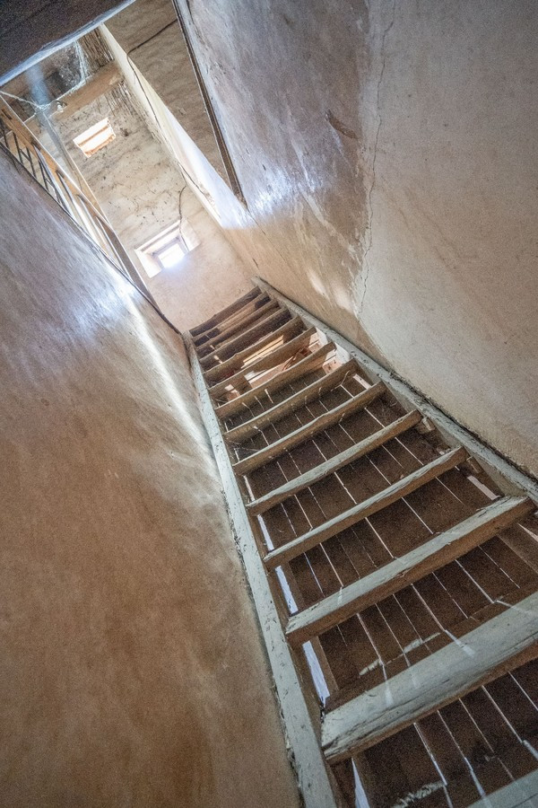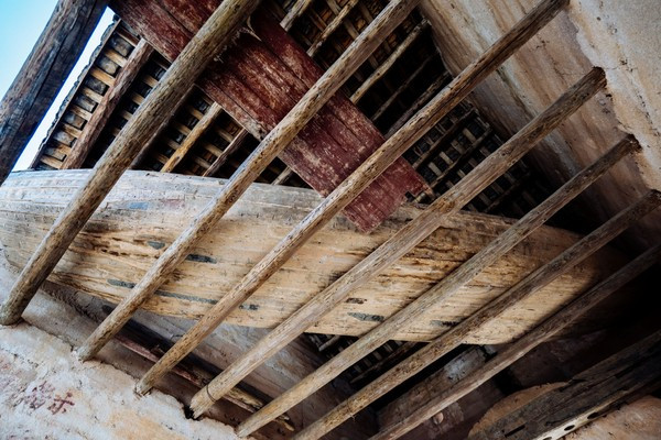 这个木船放在楼上,是为了可以下雨发洪水的时候可以坐船出去。原来林寨的人为了抵御水患,在自己的门楼上制作了一些木船,当洪水漫到一定高度的时候。他们就会将船体推下运送物资,抢救人员。这个船主要是被水淹了以后,船推下来以后,可以沿着这个巷路去救济村民或者病的老人。
