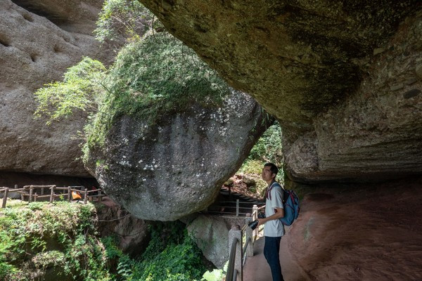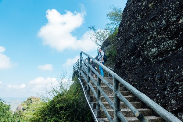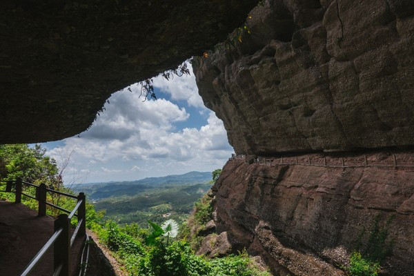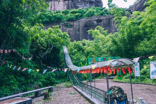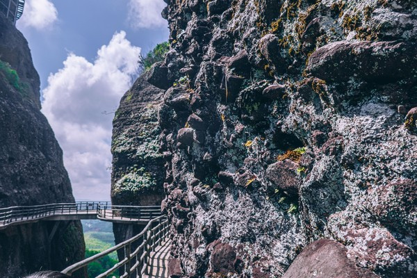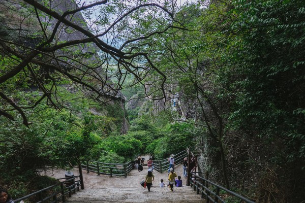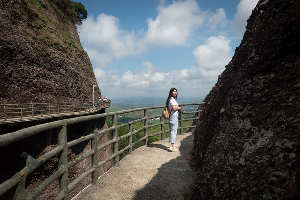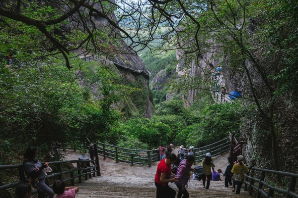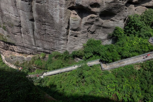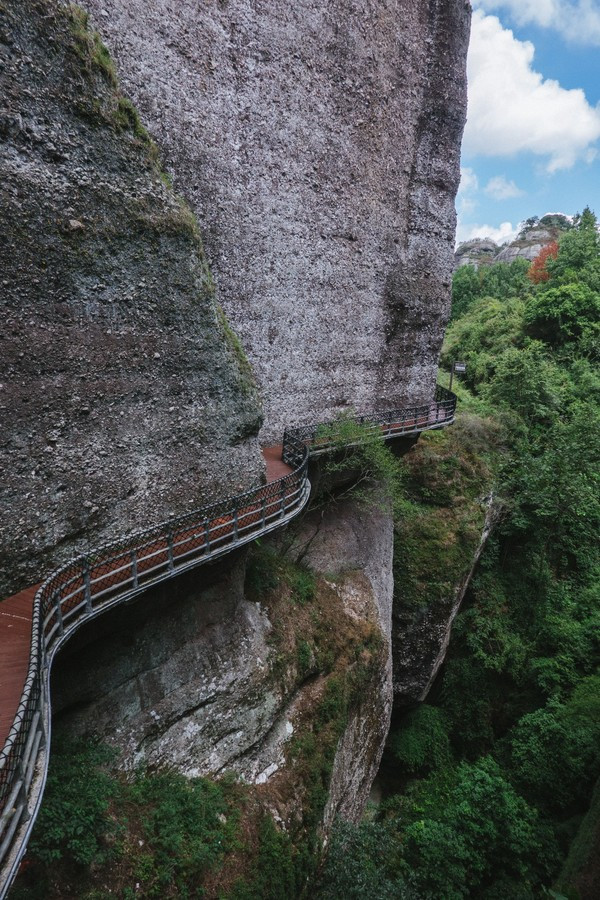 我们现在看到的这条路,算是一条走上来的捷径,我们还是把它当做返程路更好。远处的景观也更加漂亮,大家算是一个保护区,所以他不会开发更多的山峰给你去爬,但实际上丹霞山的群山真的是非常多的,在霍山呢,只可玩性这么高,竟然还有玻璃桥!