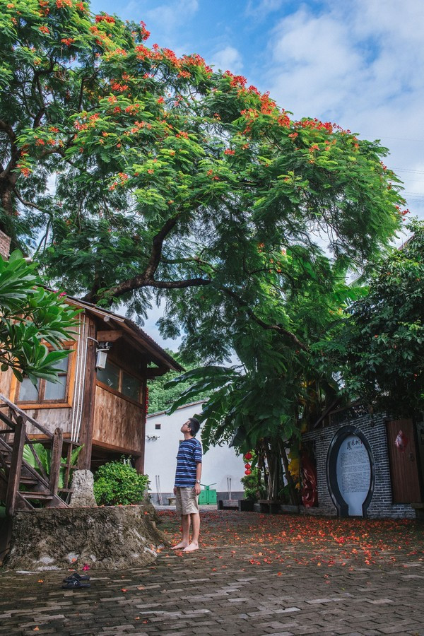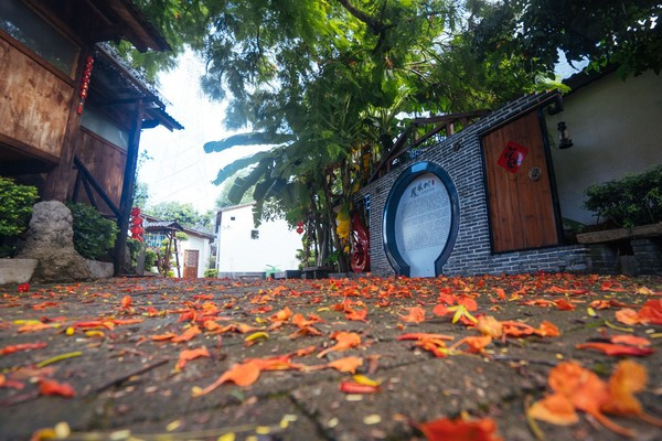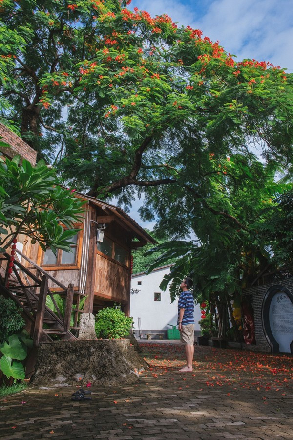我们在这里还看到了很好看的凤凰花落了一地。红艳艳的非常的好看,在整个园区里面还有池塘、白墙灰瓦,给人一种非常古雅的气息,这样的民宿,你想来住吗?