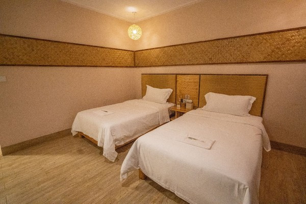三层的客房,有好几栋,来到这里的人都是单纯放松度假的,简单极致的装修,白墙,原木的门窗,推拉窗户,走廊铁丝吊灯,竹子做的椅子,鹅卵石铺就的地面,可以很原生态。