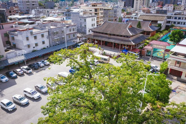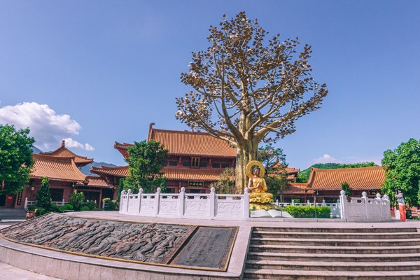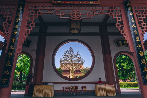 寺庙中央伫立着全球首座户外菩提圣树,高13.7米,与云冈石窟第二十窟大佛像等高,由18吨仿金纯铜铸成,树上铸有4800片金叶,数字取自佛诞,圣树枝繁叶茂,寓意事事顺心。