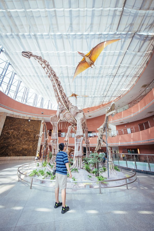 真正好看的部分是在博物馆里面,它建有长338米、高4米多、总跨度800米的大型《恐龙梦幻世界》雕塑墙,以及高9米的恐龙主体雕塑和10组钢铁恐龙创意雕塑。与恐龙骨架雕塑的合影是非常难得的,这时候我们只需要到我们面前,拍一张仰望他的照片就非常好看该馆占地面积3100平方米,建筑面积8300平方米,展览面积2800平方米,以恐龙为主题,分《恐龙产房》《恐龙足迹》《恐龙故乡》三个展厅。