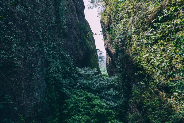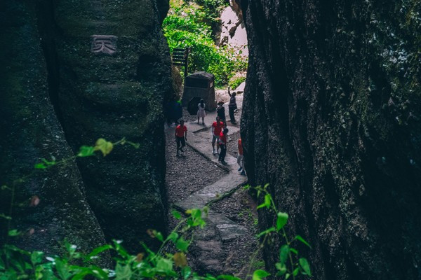 在经过一线天之后,还有一块大石头夹在两山之间,不知道是什么时候掉出来的,下面就形成了一个天然的洞穴,坐在这里感觉都非常的凉爽。一线天,是我国名山奇峰中常有的石景,因两壁夹峙,缝隙所见蓝天如一线而得名。这里的山风也是很清凉的。