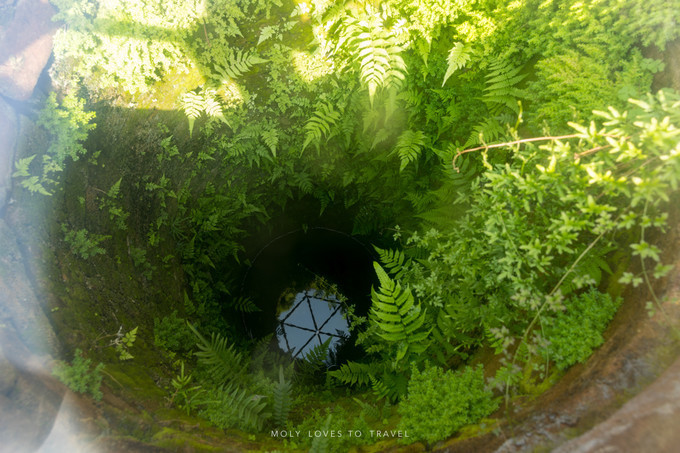 透过玻璃,能清楚的看到长了蕨类草的井壁以及清澈的井水。