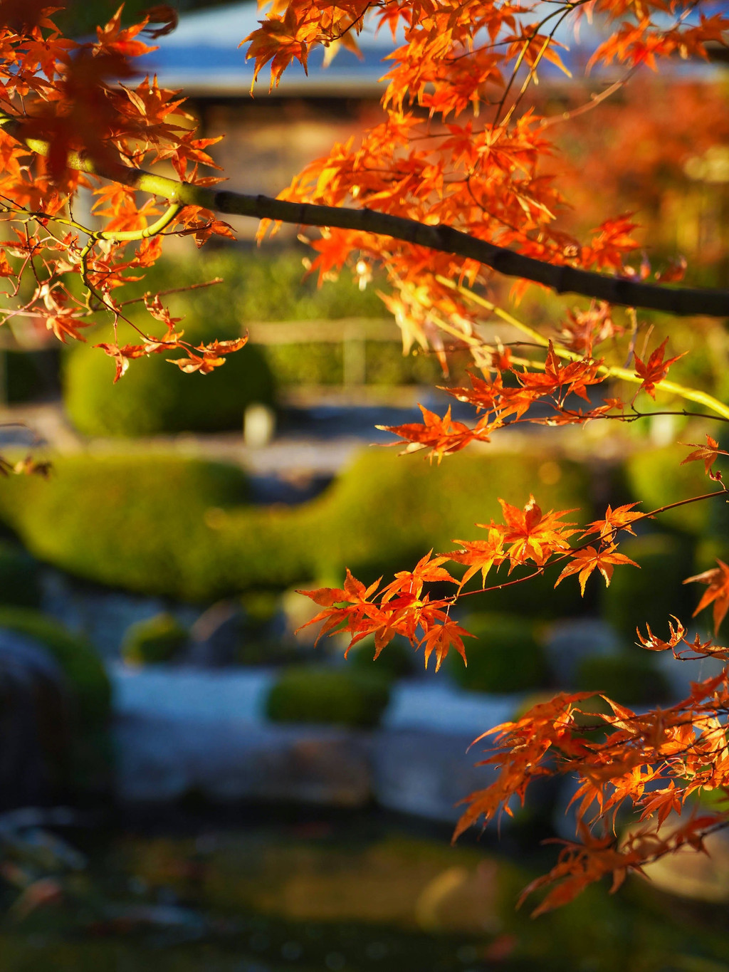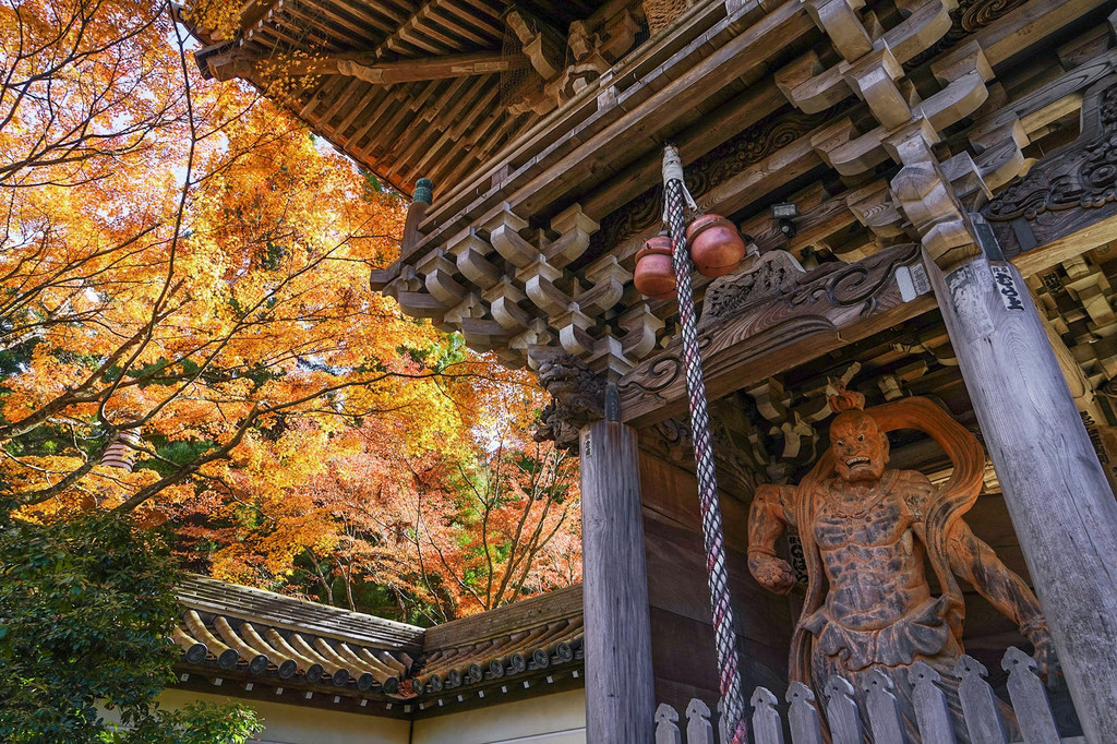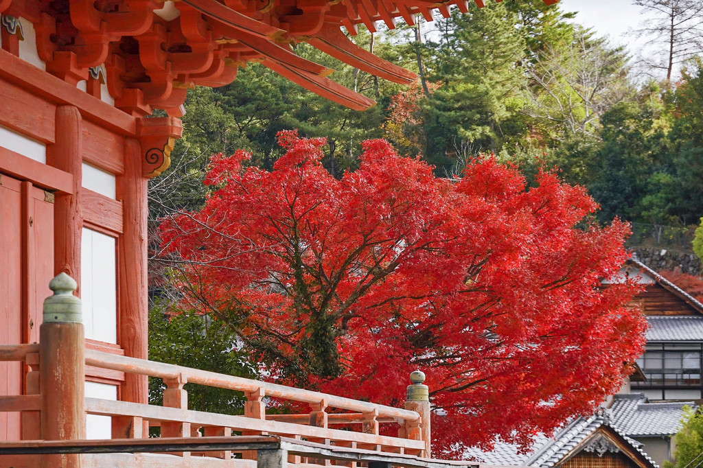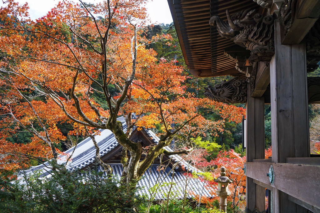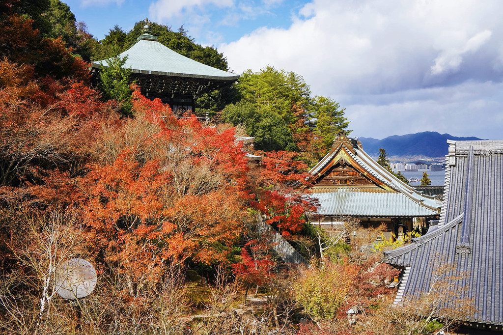 在大圣院的最高处登高远眺,层林尽染的红叶和远处的濑户内海融合成了一副秋日最五彩斑斓的画卷。