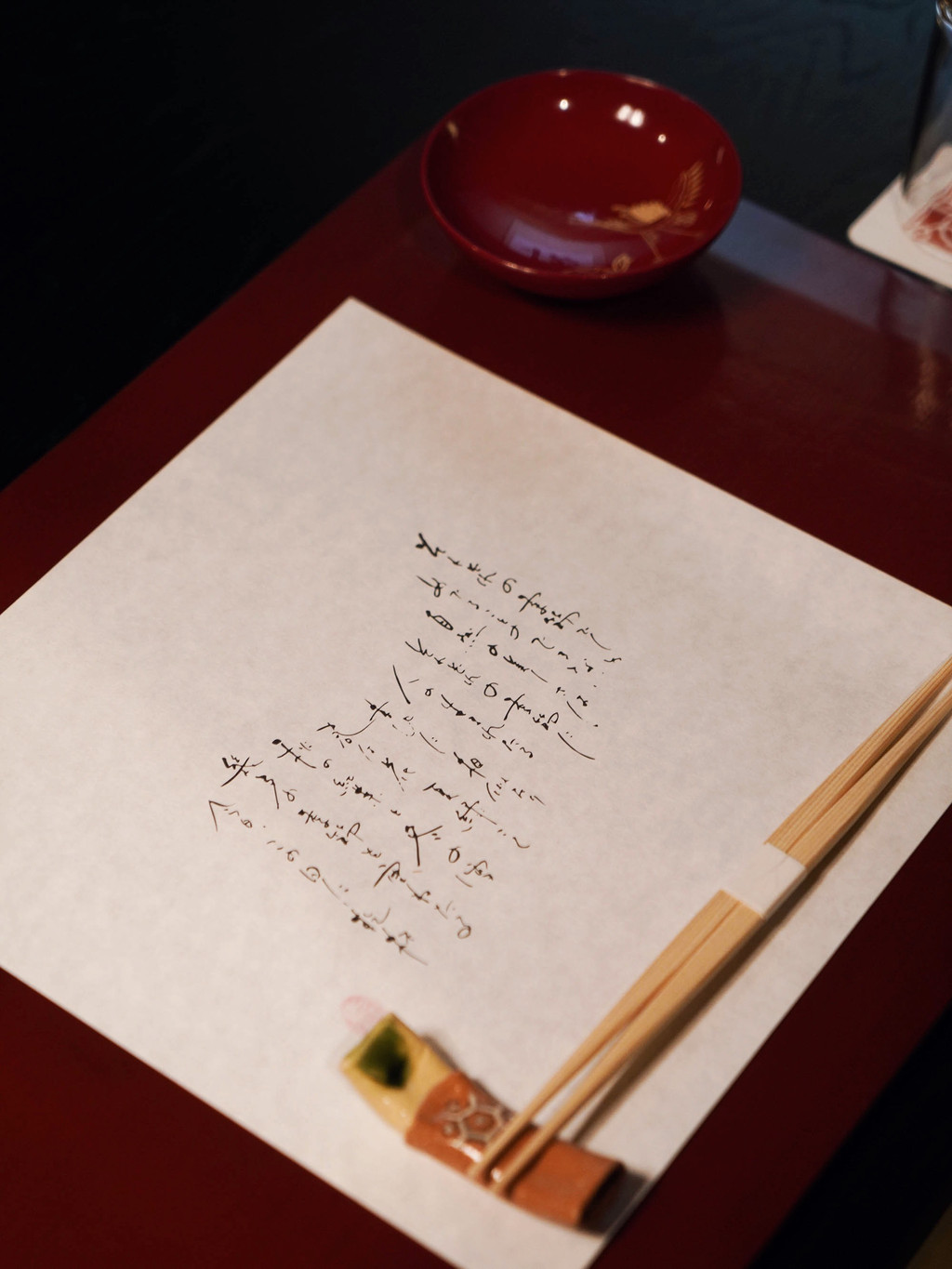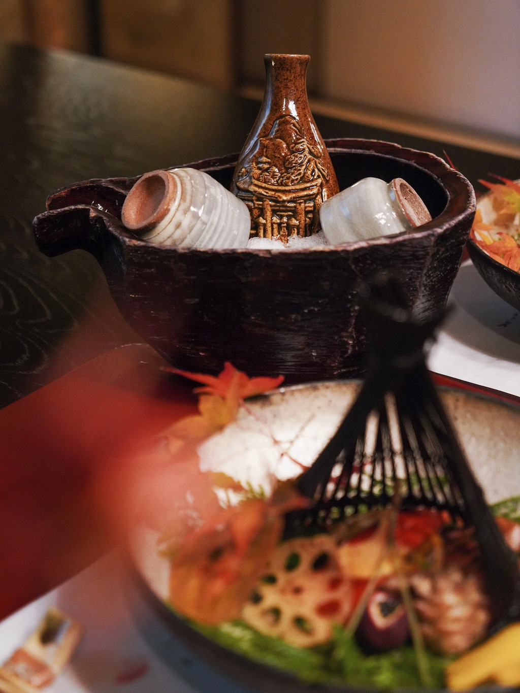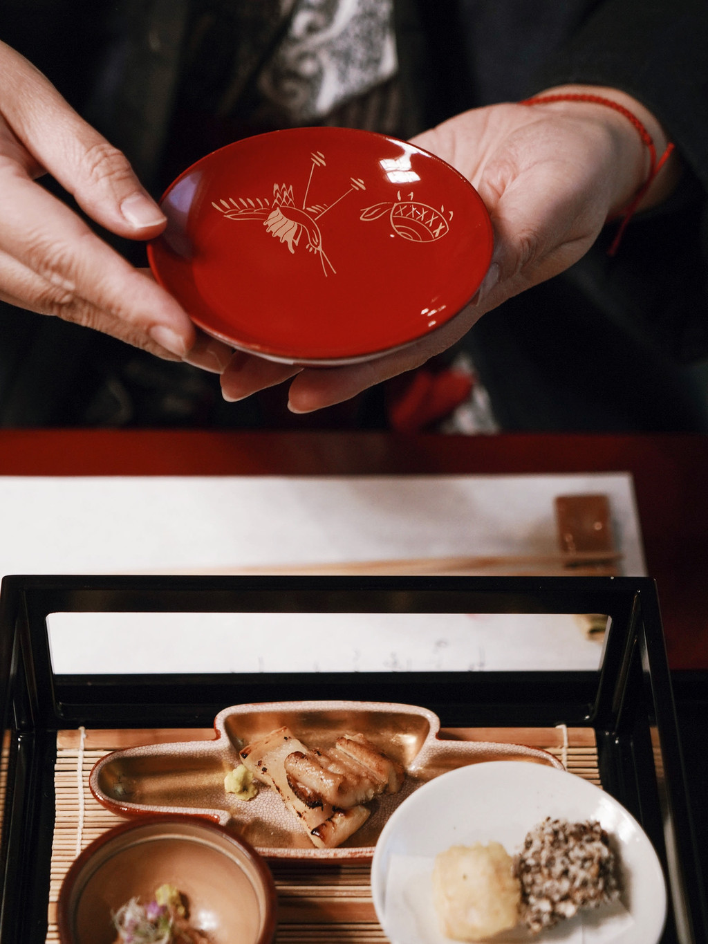 秋天的菜单有一个很诗意的名字:“秋天一碧”,餐前酒是用一个有点像盖子的红色大漆敞口杯盛以广岛当地产的清酒,酒器器型除了特别,杯底还有用金箔绘制的仙鹤和龟这两种日本传统吉祥动物的图案。
