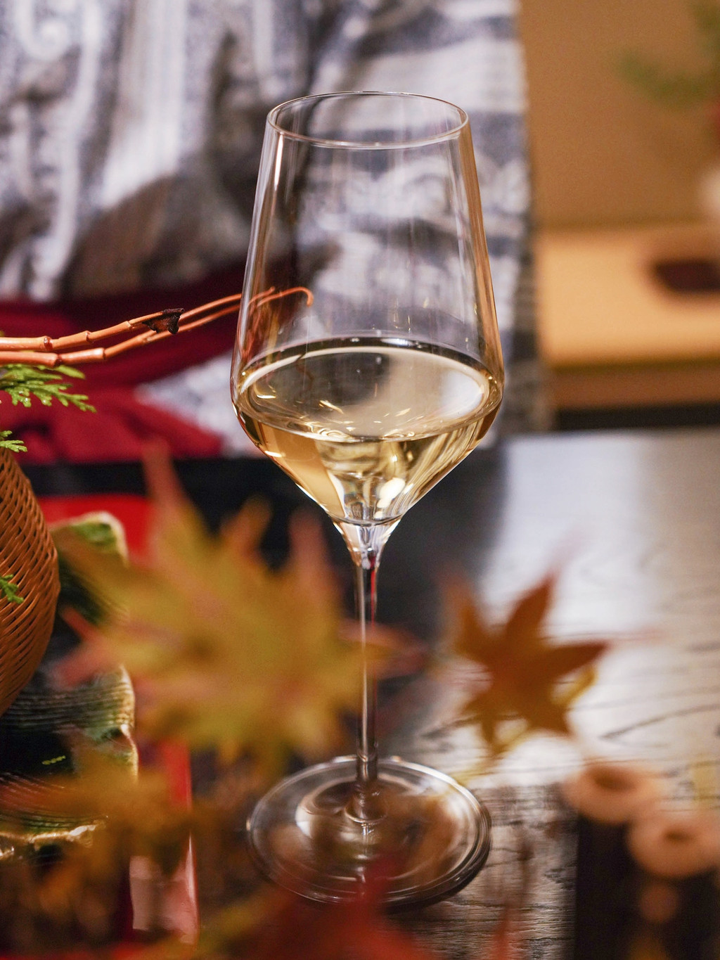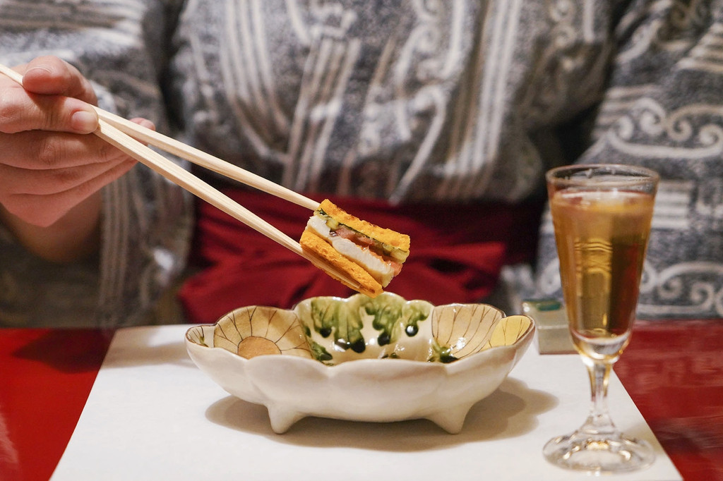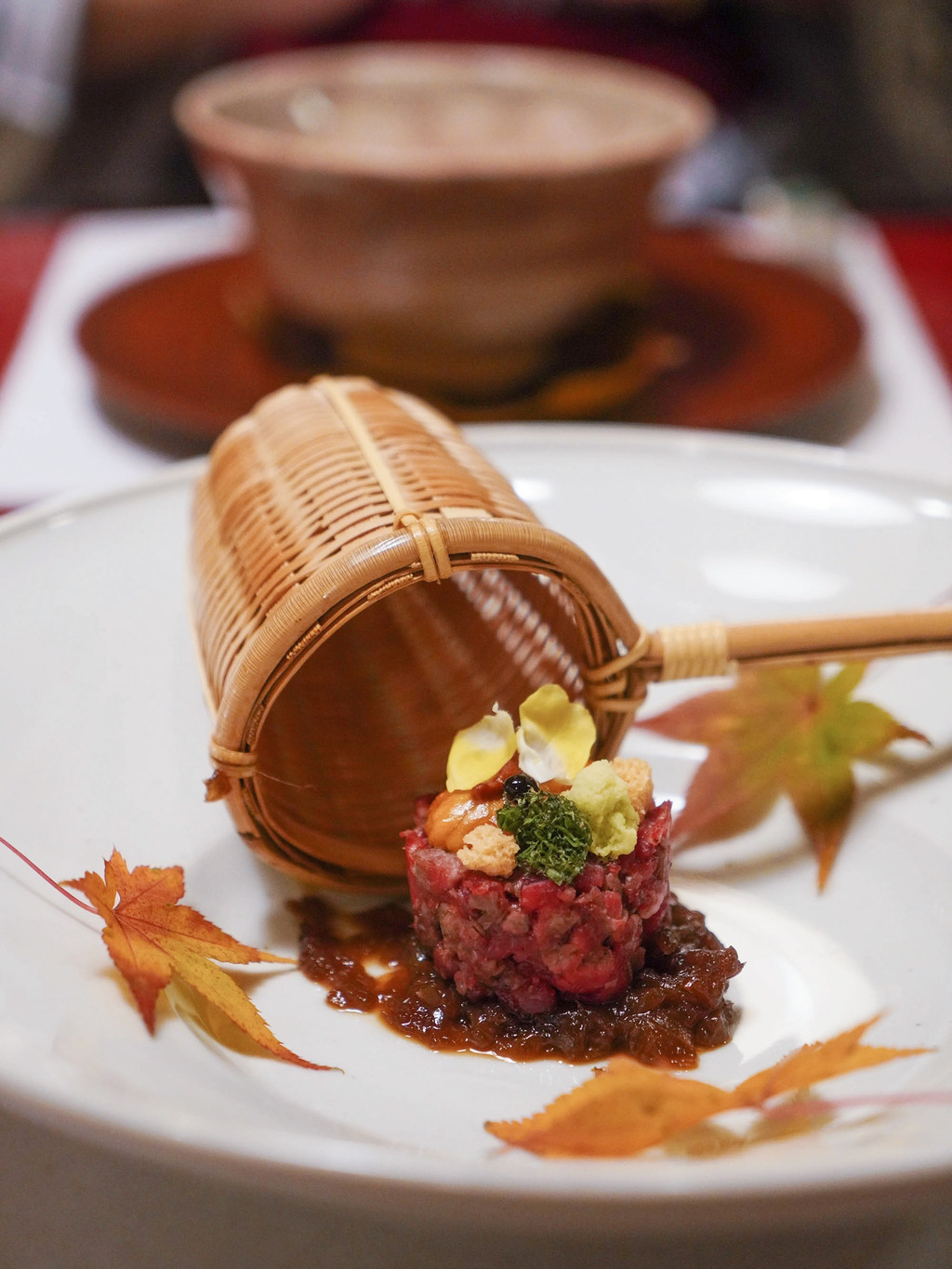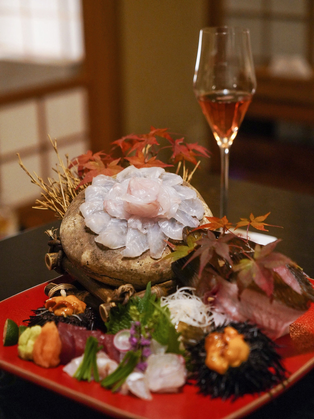 秋天的菜单有一个很诗意的名字:“秋天一碧”,餐前酒是用一个有点像盖子的红色大漆敞口杯盛以广岛当地产的清酒,酒器器型除了特别,杯底还有用金箔绘制的仙鹤和龟这两种日本传统吉祥动物的图案。