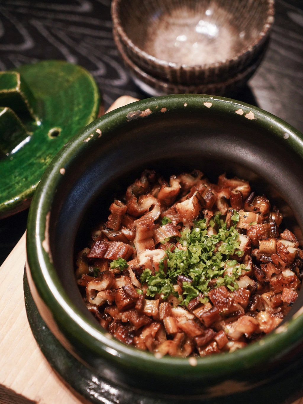接下来的“石烧”是一口井造型的石制容器盛以鲇鱼饭,里面还加了白果和葱一起放在火上煮,所以上桌的时候被提醒说要小心烫,但这道菜趁热的时候吃非常好吃,鲇鱼肉质紧实,口感鲜美。
