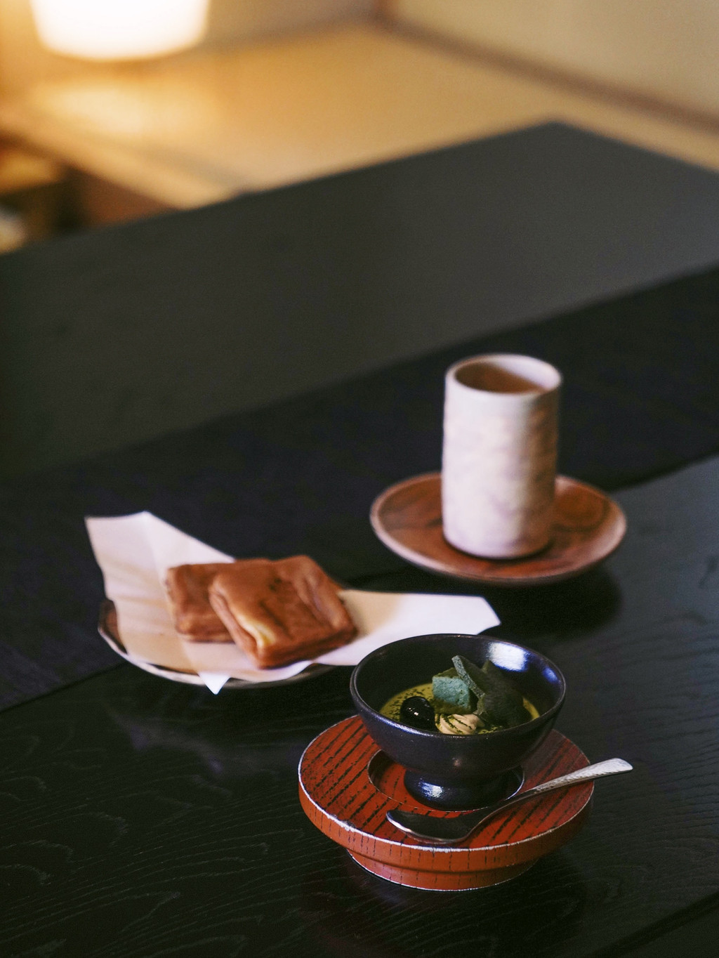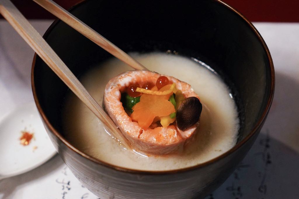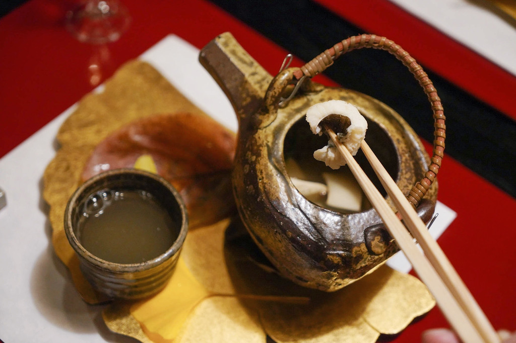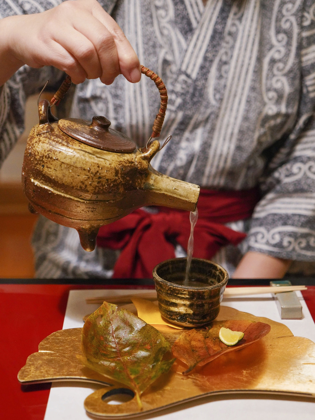 “椀物”的呈现简直绝了,松茸炖的鱼汤用柴烧壶作为容器,壶出汤至清酒杯中可以喝鱼汤,壶承是银杏的形状配以两片落叶,满满的秋天仪式感。
