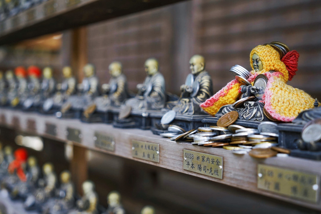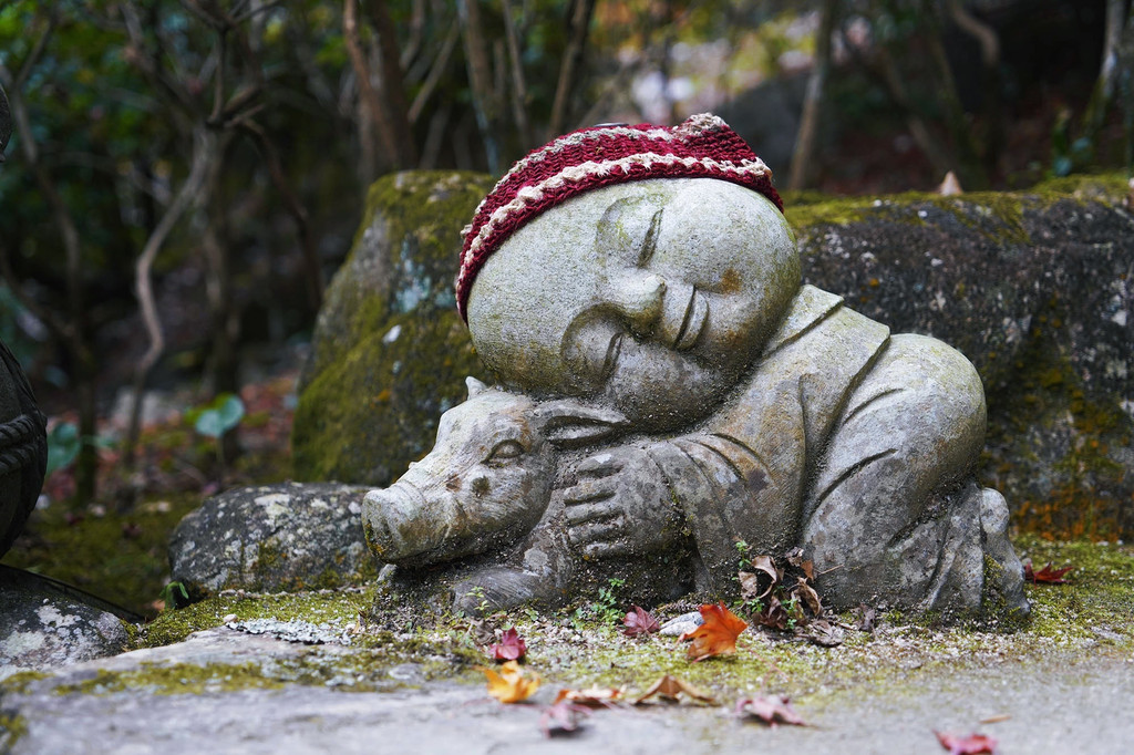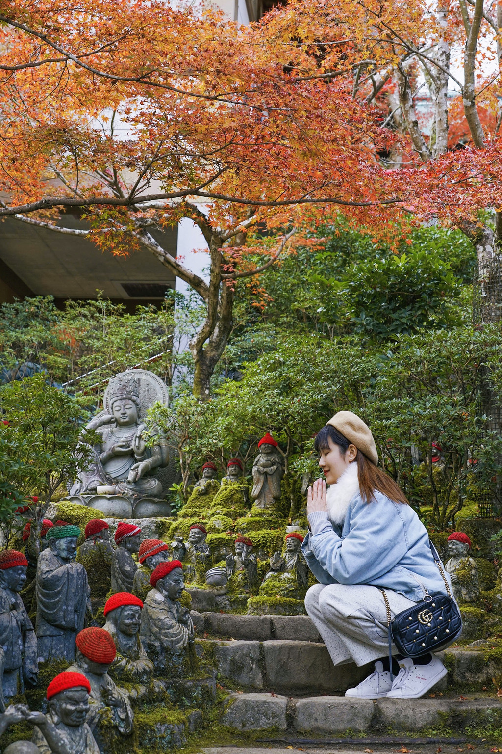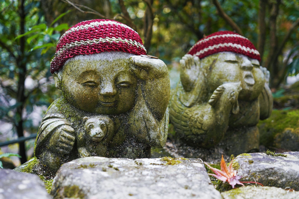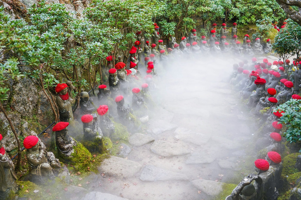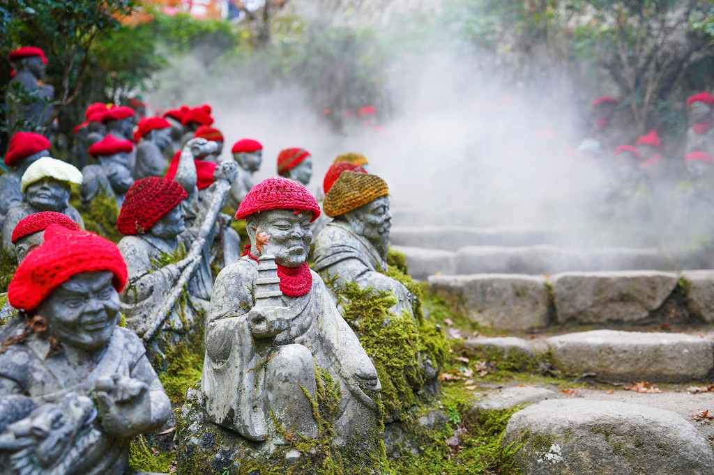 排列在通往大圣院石径上的小罗汉雕像有500尊,他们戴的针织帽是来自日本游客的礼物,这一传统在日本其他地区也有。