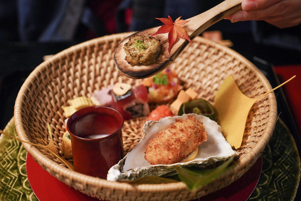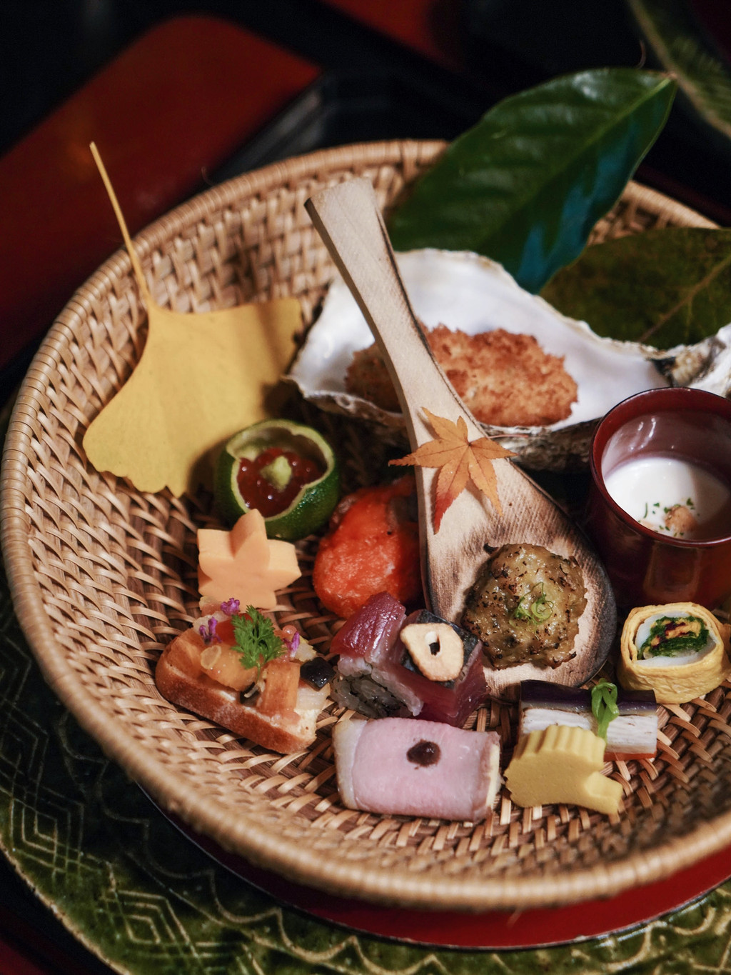 “八寸”是怀石料理中一道重要的次序,不拘烹饪方法,煮、烤、炸皆可,通常将季候食材盛为一盘,大多以山珍(鲜蔬、五谷等素菜)搭配海味,是直接呈现日本时令季节的一道料理。石亭的料理长非常重视八寸在整套料理中的呈现,第一晚的八寸有红叶形状的胡萝卜慕斯、银杏形状的栗子慕斯、鲷鱼籽卷、炭火鲣鱼寿司、红薯虾球等,还有广岛特产牡蛎的两种吃法:碳烤牡蛎和炸牡蛎,配的酱汁都是自家秘制的。