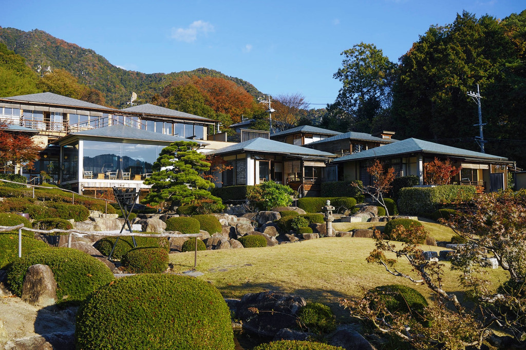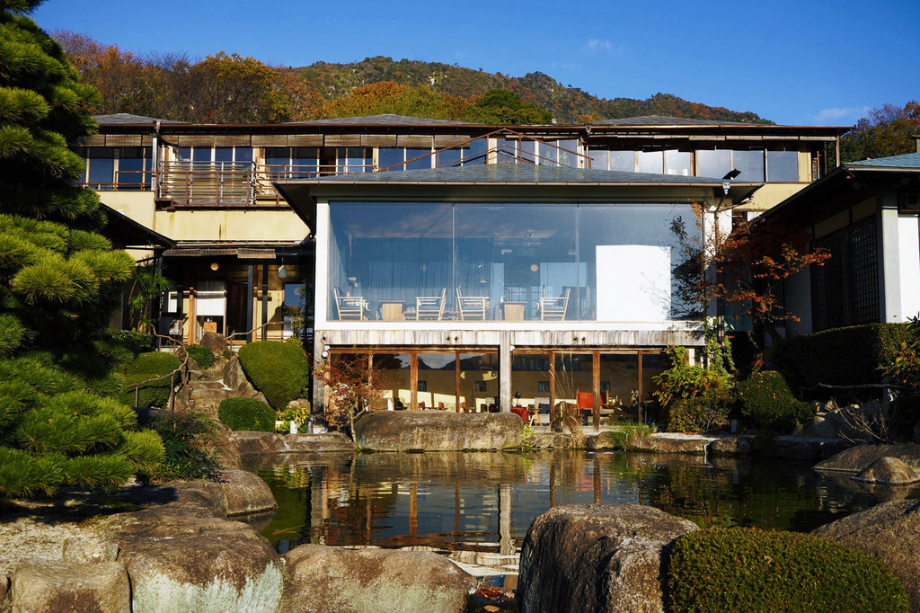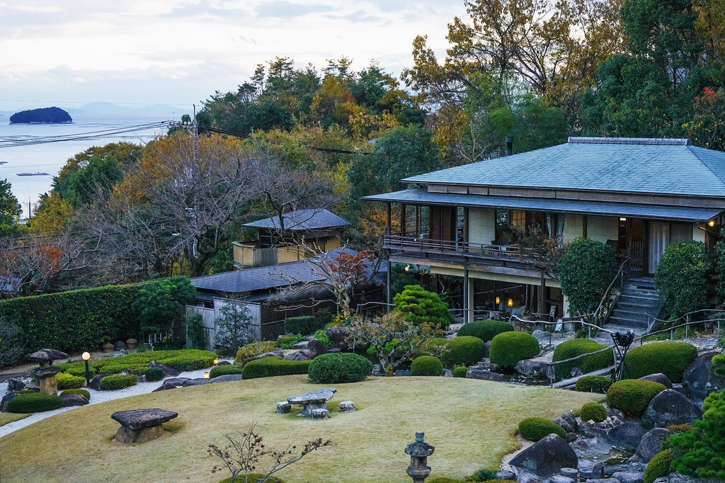 “石亭”建在一座缓坡上,面对濑户内海和宫岛,背靠岩石京古屋山,是一座真正的依山傍海的庭院温泉旅馆。 世界各国的专家曾经从包括旅馆和别墅在内的约1000个候选地中选出的日本庭园中,石亭的庭院排名第5,这个庭院也经常被建筑杂志拿来当日式庭院优秀设计的案例。