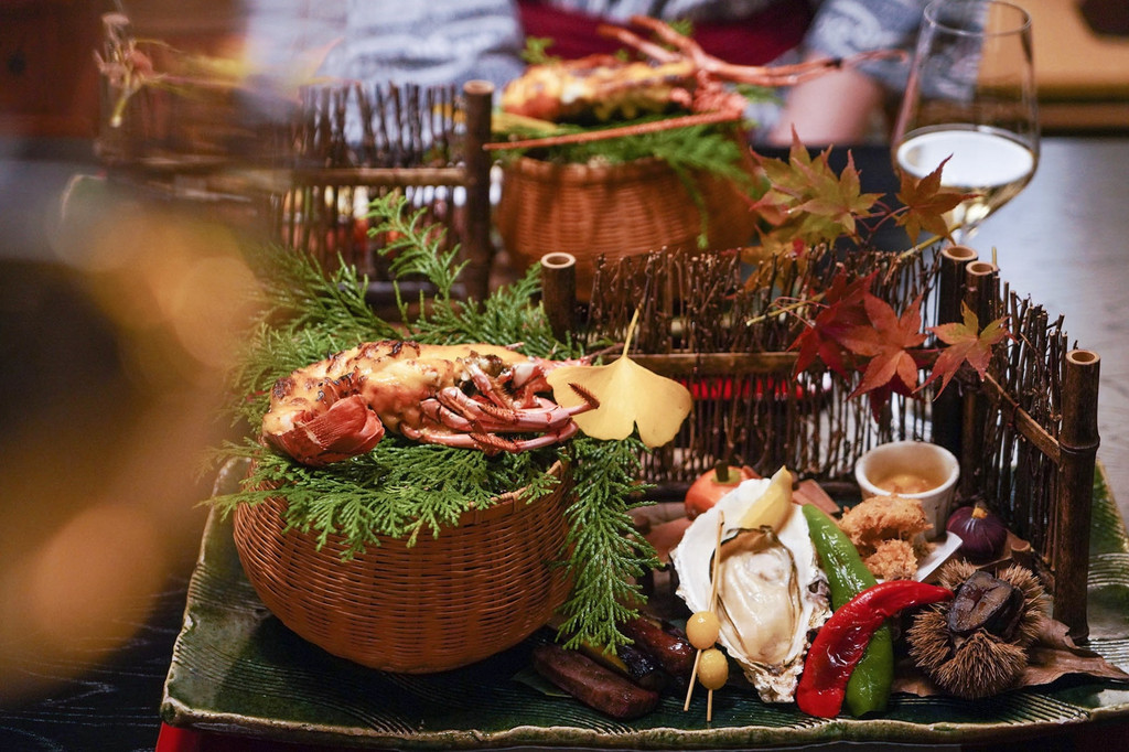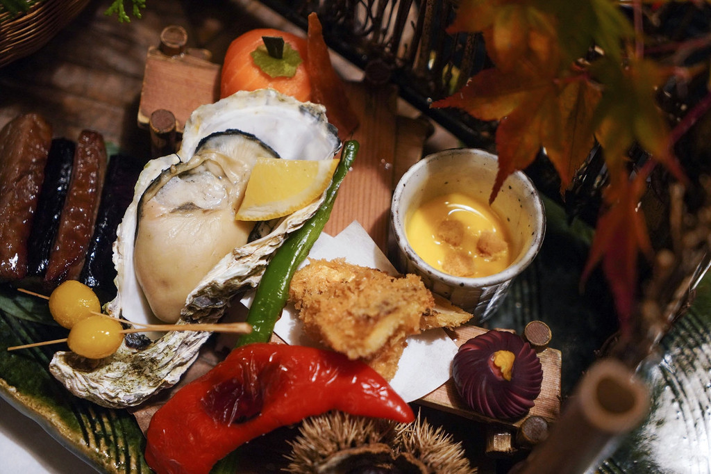 第二晚的“烧八寸”颜值拉到了顶峰,摆盘造景呈现的是秋天的庭院,主角是紧实鲜甜的伊势龙虾和广岛牡蛎,广岛产的牡蛎不仅个头硕大,而且口味丰富。