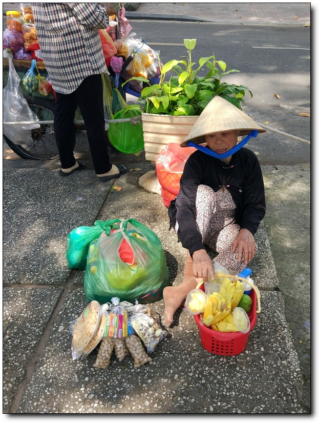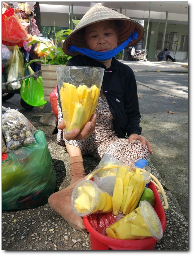 卖干果、水果的小贩不容易啊,见她的青芒很新鲜,就买了一袋(20K越南盾)。