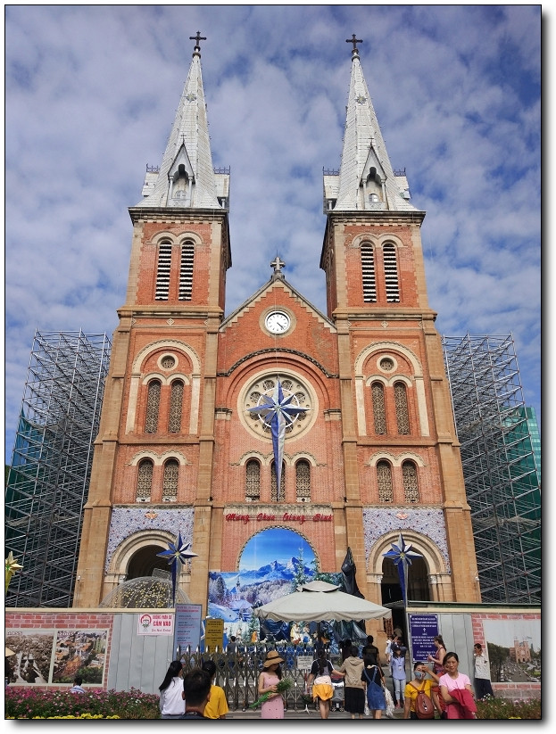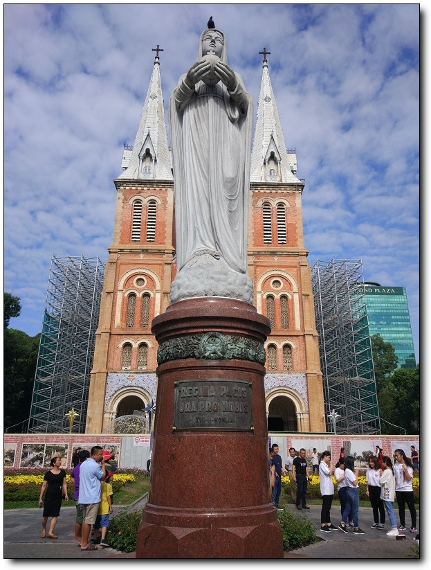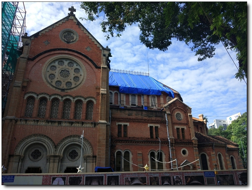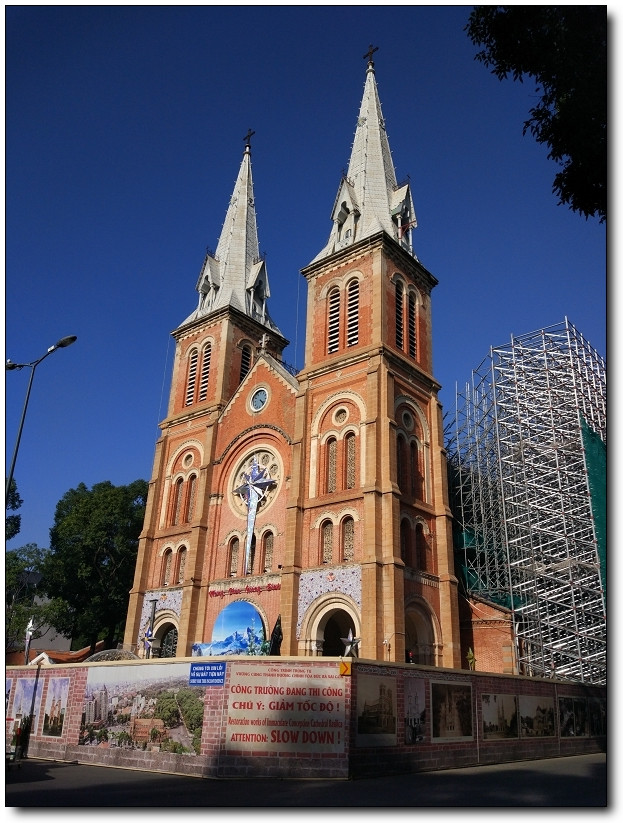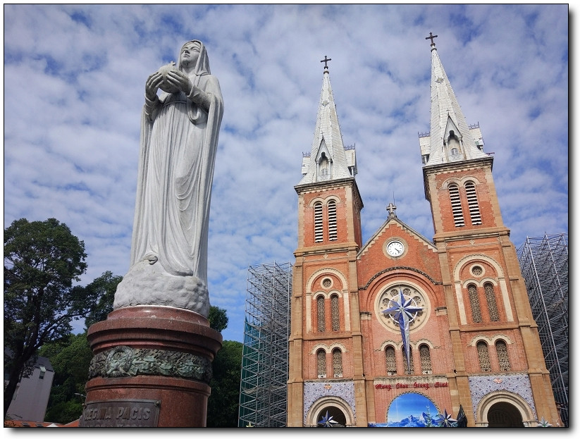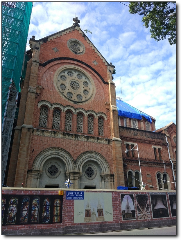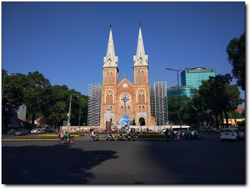 西贡圣母大教堂建于19世纪末,是法国殖民时期的产物。大教堂是典型的哥特式建筑,造型匀称,庄严宏伟,因其使用红砖建造,又被称为红教堂。