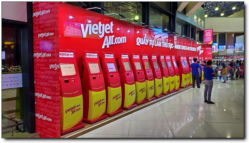 到越捷航空公司的自助机上打印登机牌后,即可过安检进入候机大厅。