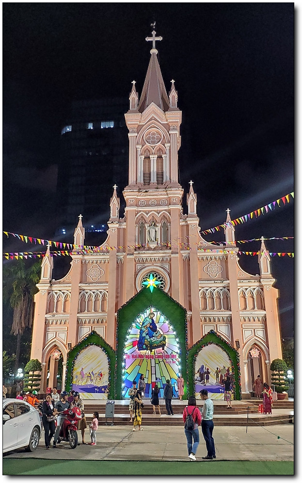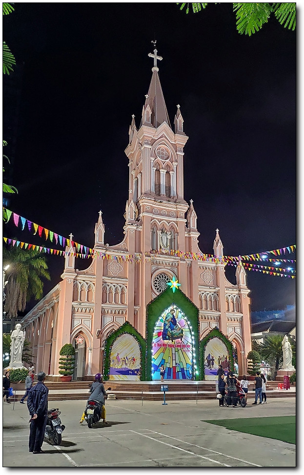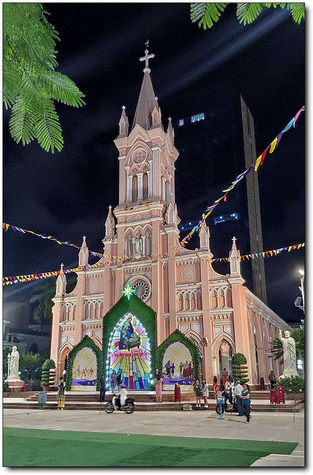 再次路过岘港大教堂,晚上跟白天的视觉完全不一样,漂亮多了。来得正是时候,来早的话,人多车多,拍照不好看;来晚的话,关门了。