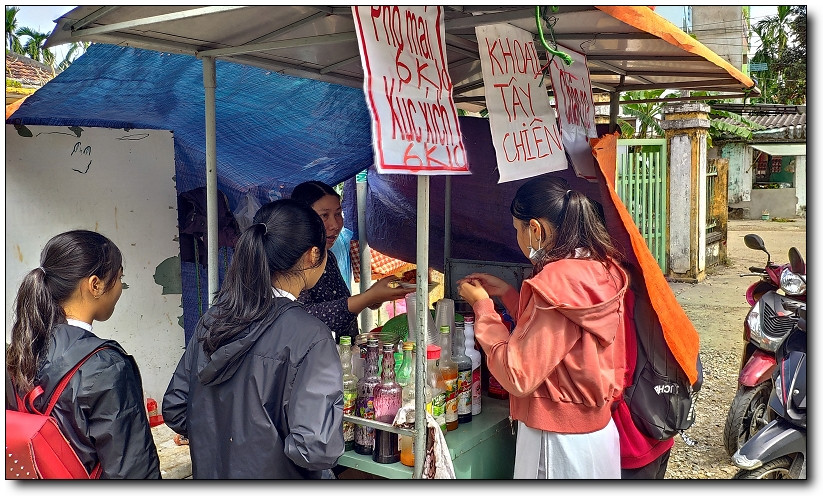 学校门口对面的士多有几个学生买东吃的,嘿!我国的学校何尝不是这样,学生放学就会到士多买吃的。