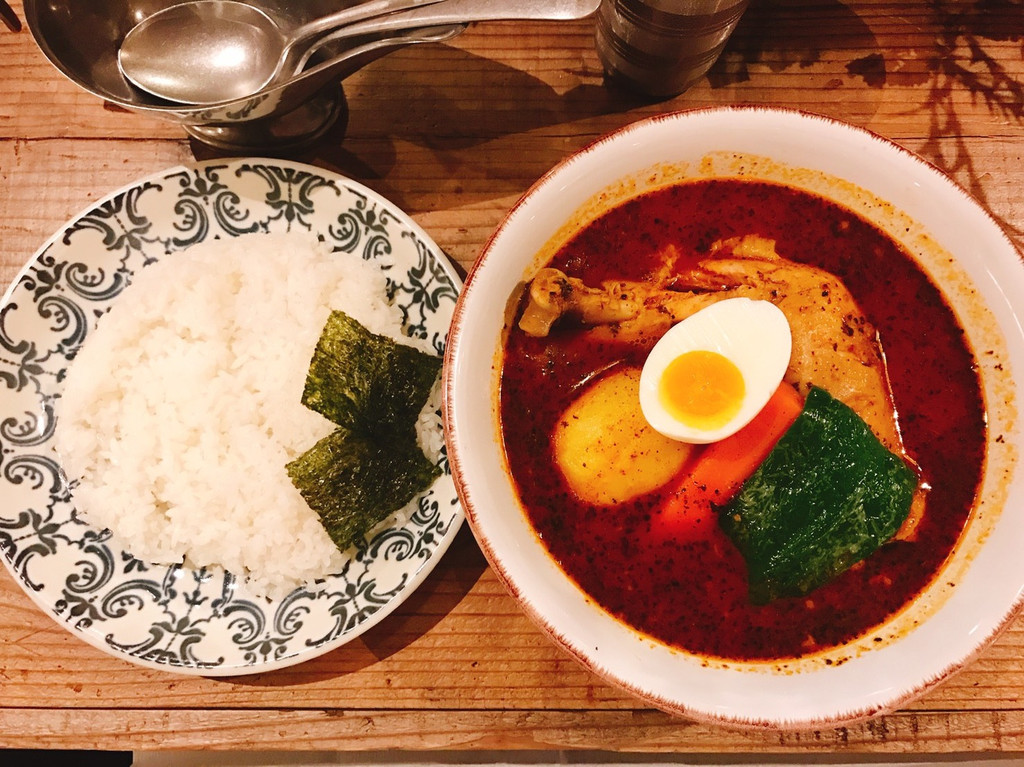 来札幌当然要吃汤咖喱「らっきょ」エスタ店「道产鸡肉汤咖喱1350日元」汤咖喱的辣度有0~10共计11个辣度可以选择,女孩子3就可以。蔬菜,肉配上汤汁再来碗米饭,吃的太撑,去狸小路散步1小时,