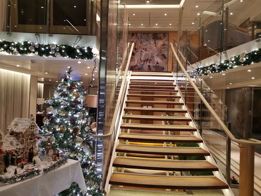 爸妈住了三层,我和闺蜜住在底层船舱里。我们后面的房间应该就是工作人员住的,经常看到小红帽、厨师、钢琴师在本层出没。后方台阶上也能碰到下班后的餐厅工作人员。
